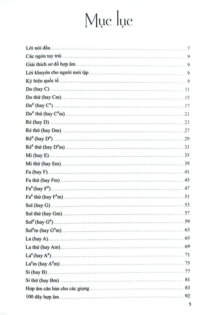 Sách giới thiệu 100 thế bấm các hợp âm thường dùng nhất. Mỗi hợp âm được ghi 4 thế bấm khác nhau trên cần đàn, trừ một số hợp âm trưởng và hợp âm 7 được cho 8 thế bấm.