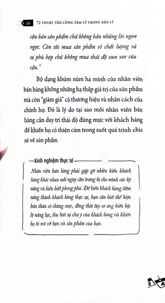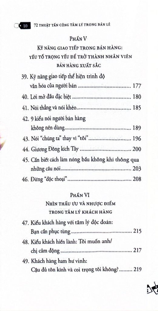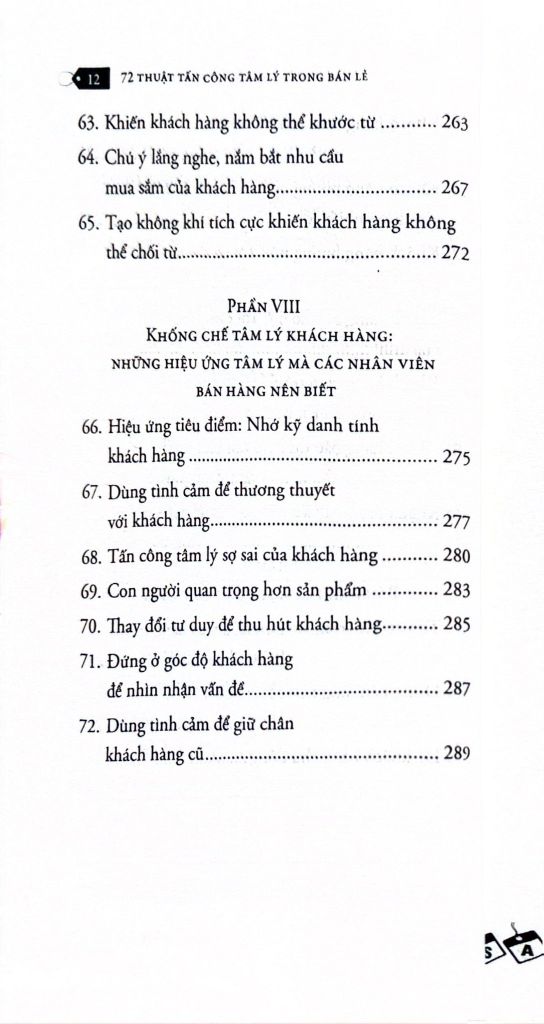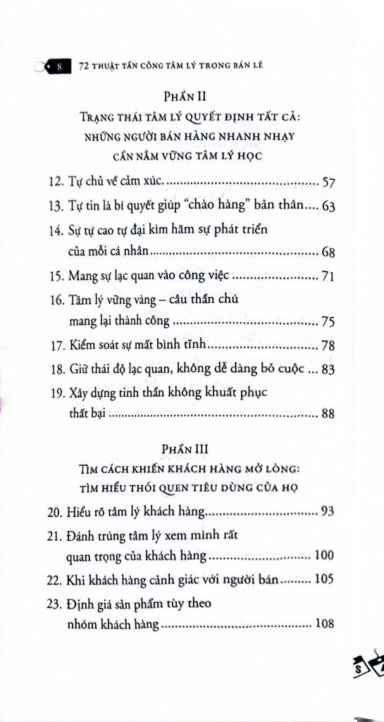 72 thuật tấn công tâm lý trong bán lẻ được đúc rút từ thử nghiệm và minh chứng thực tế sẽ mang đến cho các nhân viên bán hàng cũng như các nhà quản lý những ý tưởng mới mẻ, độc đáo và thú vị, trở thành hành trang "bất khả chiến bại" của các bạn trong mọi giao dịch
