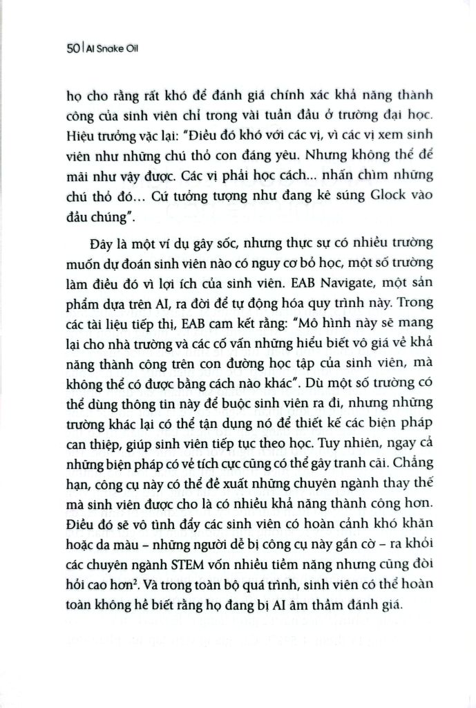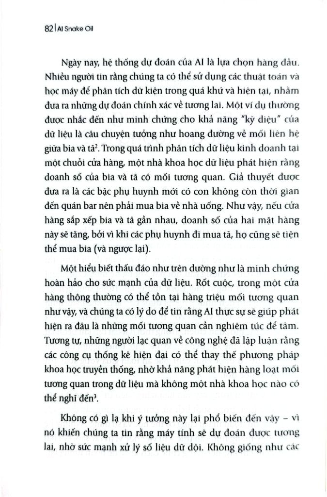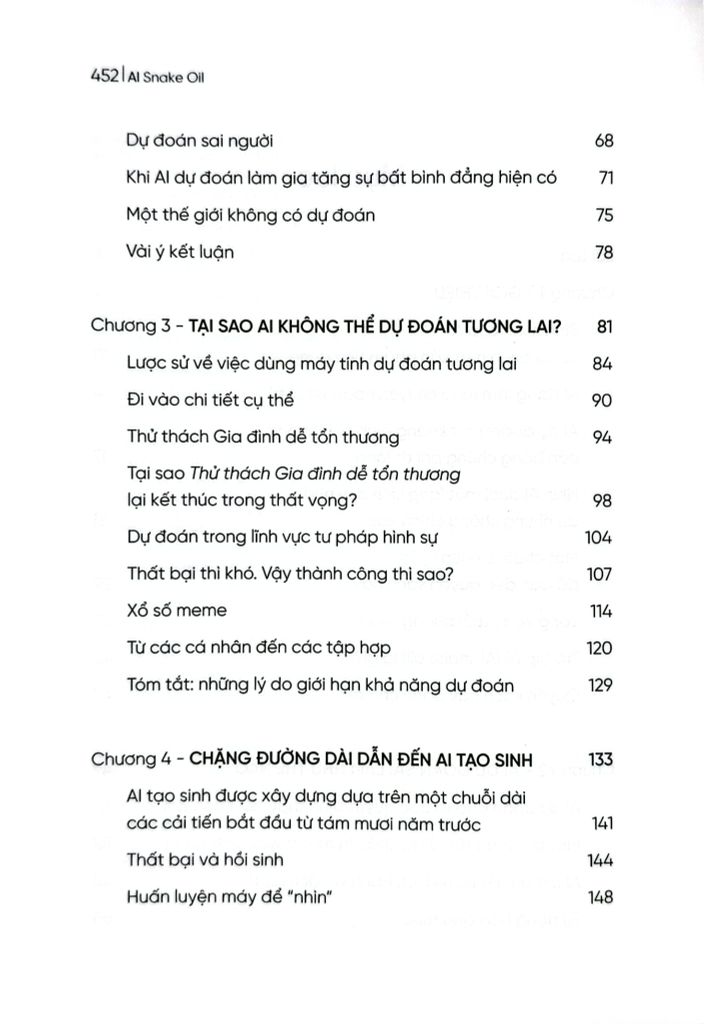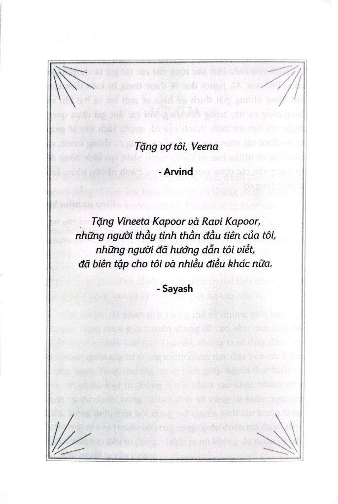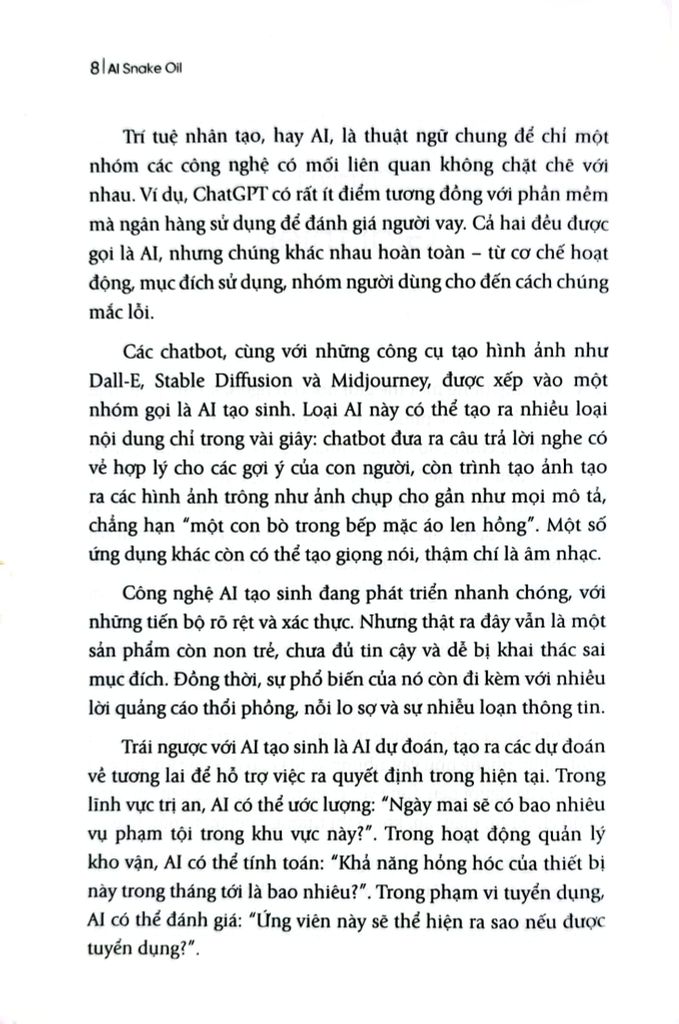 “AI Snake Oil” là quyển sách không thể bỏ qua nếu bạn đang hoang mang trước làn sóng AI. Hai chuyên gia hàng đầu – Sayash Kapoor và Arvind Narayanan, những người nằm trong danh sách TIME 100 AI – sẽ chỉ ra đâu là tiềm năng có thật, đâu là chiêu trò quảng cáo thổi phồng. Quyển sách vạch trần những tuyên bố sai lệch về AI trong các lĩnh vực giáo dục, y tế, tài chính, pháp luật, và mạng xã hội; đồng thời cung cấp công cụ để bạn tự bảo vệ mình trước các sản phẩm “AI bịp bợm” – vô dụng nhưng được quảng bá rầm rộ. Tỉnh táo, sắc sảo và dễ hiểu, đây là kim chỉ nam để bạn hiểu rõ và ra quyết định đúng đắn với AI.