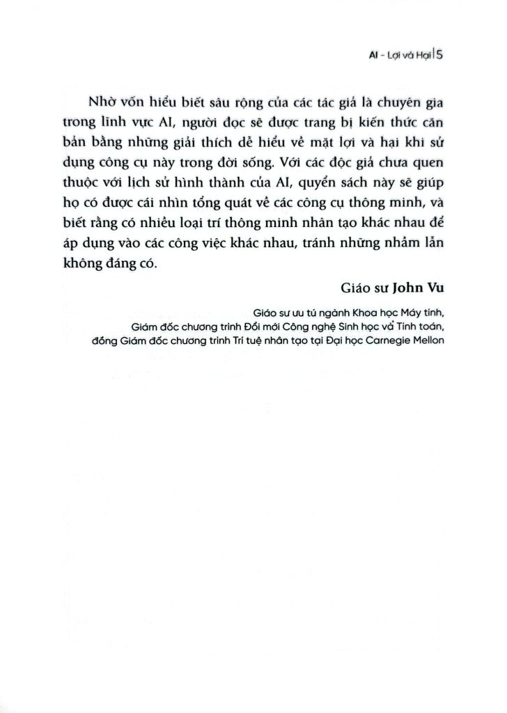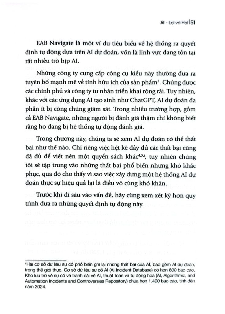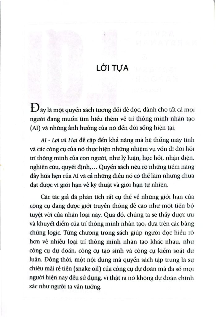 "Arvind Narayanan và Sayash Kapoor có khả năng kỳ diệu trong việc trình bày công nghệ phức tạp bằng ngôn ngữ đơn giản và lôi cuốn. AI – lợi và hại cung cấp lịch sử toàn diện về AI, phân tích kỹ lưỡng sự khác biệt giữa AI tạo sinh, AI dự đoán và AI kiểm duyệt nội dung. Ngoài ra, đây còn là cẩm nang đánh giá mức độ chính xác, độ tin cậy và ứng dụng xã hội-thương mại của AI."