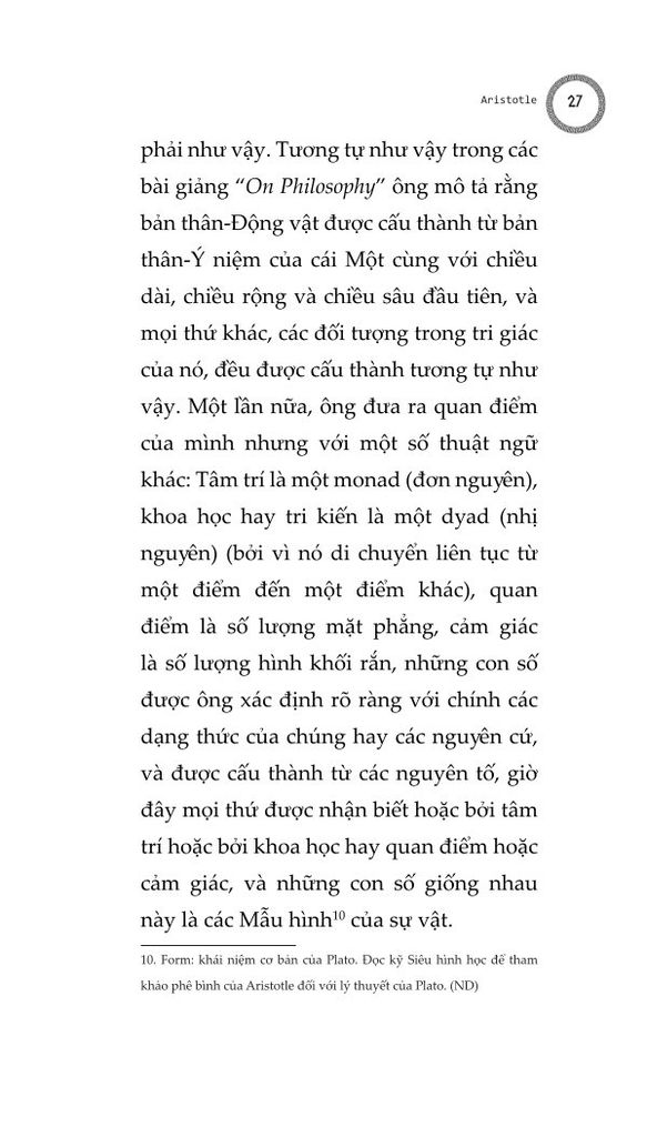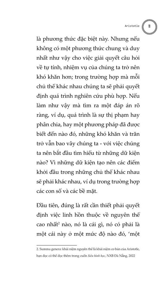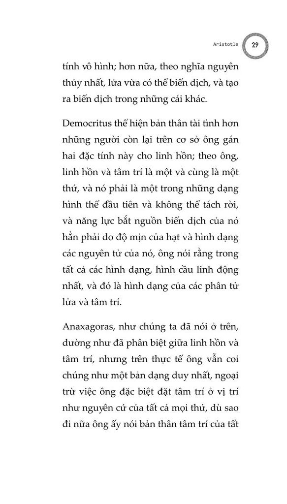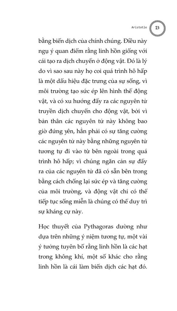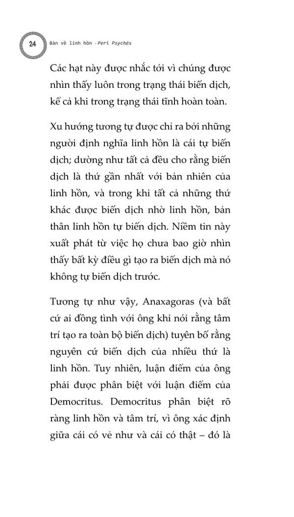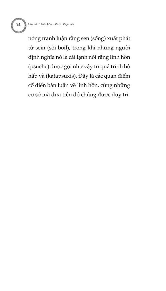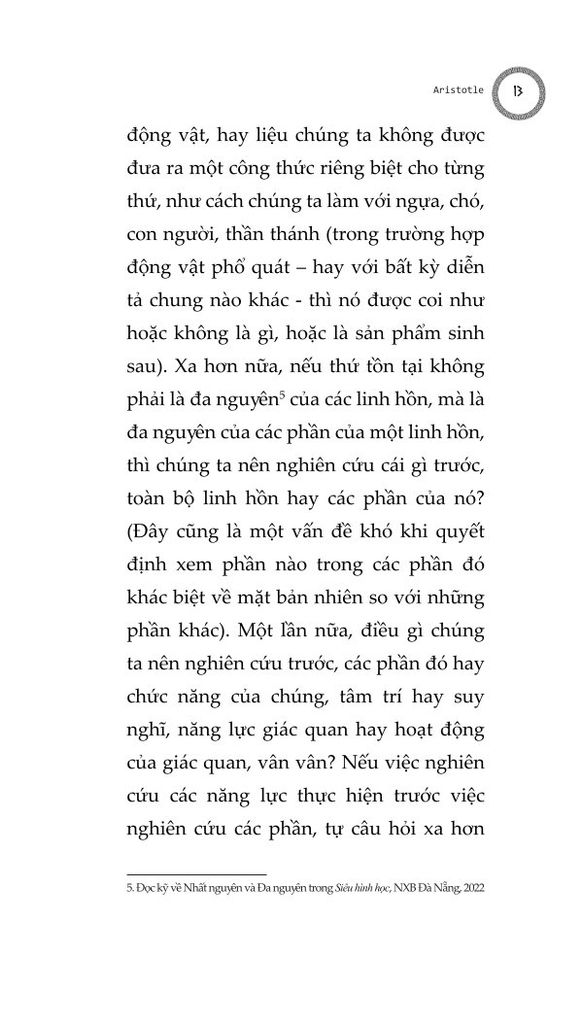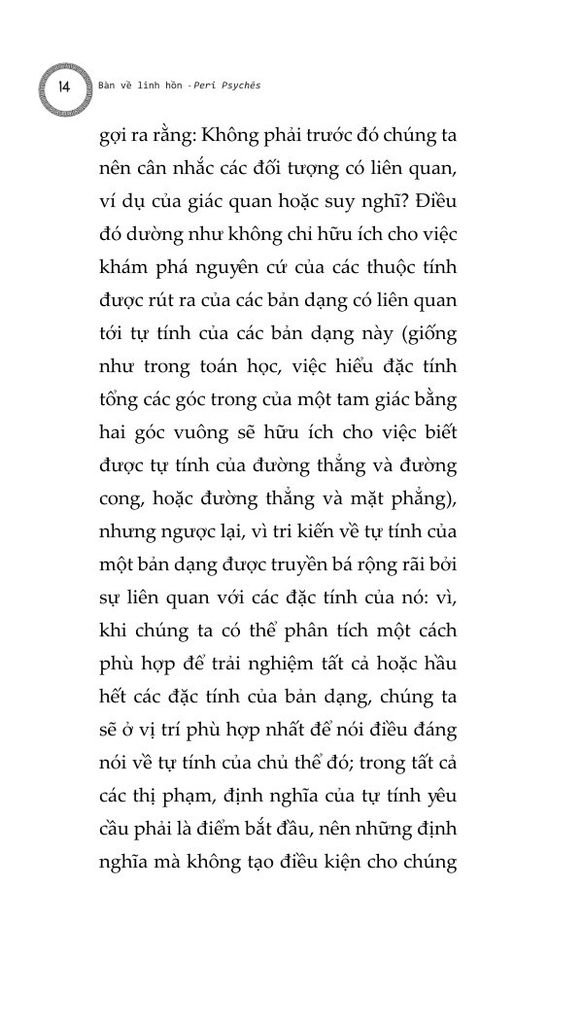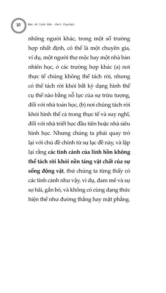 Chúng ta cũng phải cân nhắc tới việc liệu linh hồn có thể phân chia được, hay không thể chia tách thành các phần, và liệu nó có đồng nhất ở mọi nơi hay không, và nếu không đồng nhất, thì liệu các dạng thức của nó sẽ khác nhau một cách cụ thể, hay khác nhau ở dạng nguyên thể: cho tới nay những người đã và đang thảo luận và nghiên cứu linh hồn dường như giới hạn bản thân họ trong khuôn khổ linh hồn con người. Chúng ta phải cẩn thận để không bỏ qua câu hỏi liệu linh hồn có thể được định nghĩa trong một công thức duy nhất rõ ràng, như trường hợp của động vật, hay liệu chúng ta không được đưa ra một công thức riêng biệt cho từng thứ, như cách chúng ta làm với ngựa, chó, con người, thần thánh...