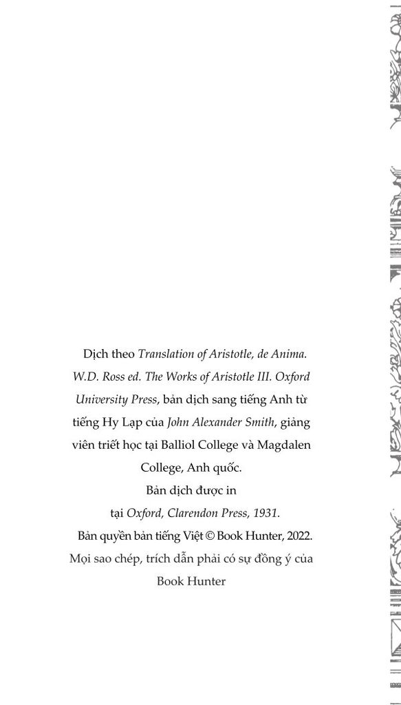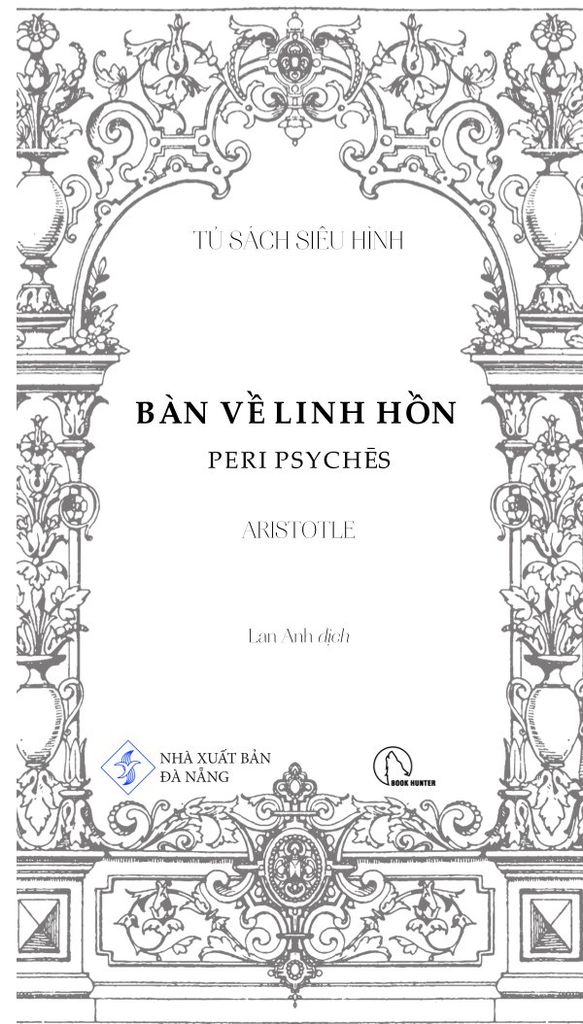 Trước tiên chúng ta phải xem xét tới dinh dưỡng và sinh sản, vì linh hồn nuôi dưỡng (dưỡng hồn) được tìm thấy cùng với tất cả các dạng linh hồn khác và là năng lực khởi nguồn nhất của linh hồn được phân bố rộng rãi, thực tế cái gì có nó đều được nói là có sự sống. Dưỡng hồn tự bộc lộ qua các hoạt động sinh sản và sử dụng thức ăn - sinh sản, tôi nhắc đến, bởi bất kỳ sinh vật sống nào khi đạt đến ngưỡng tăng trưởng bình thường của nó mà không bị tổn hại, và những sinh vật mà cách thức sinh sản của chúng không phải là tự phát, hành động tự nhiên nhất là tạo ra một sinh vật giống chính nó, động vật tạo ra động vật, thực vật tạo ra thực vật, theo cách đó, chừng nào bản nhiên của nó cho phép, nó có thể trở nên bất diệt và linh thiêng. Đó là mục tiêu mà tất cả mọi thứ đấu tranh để giành lấy, vì bất kỳ mục đích gì chúng làm mà bản nhiên của chúng có thể thực hiện.