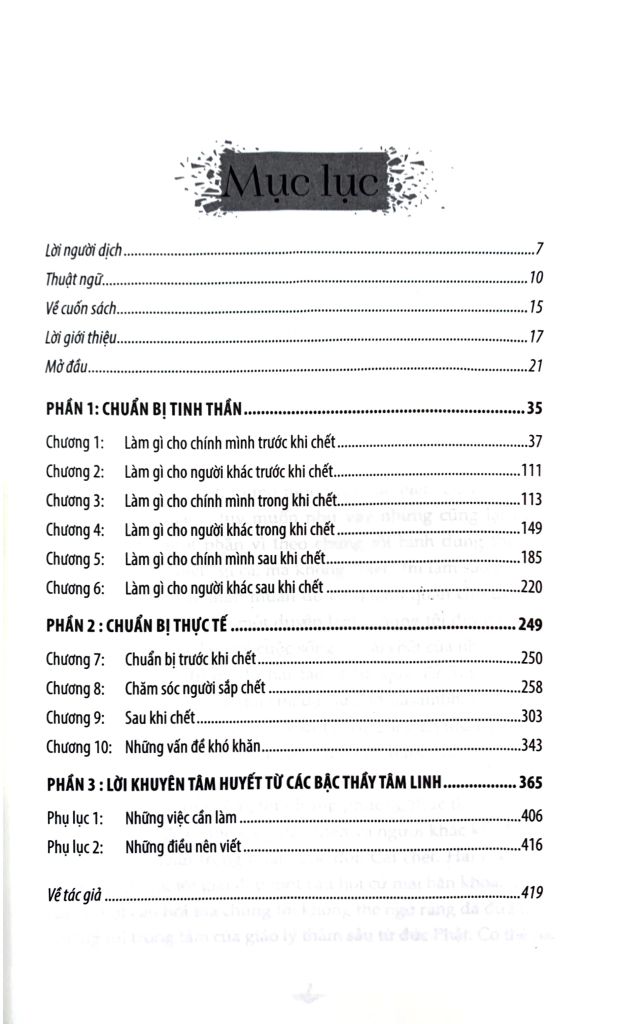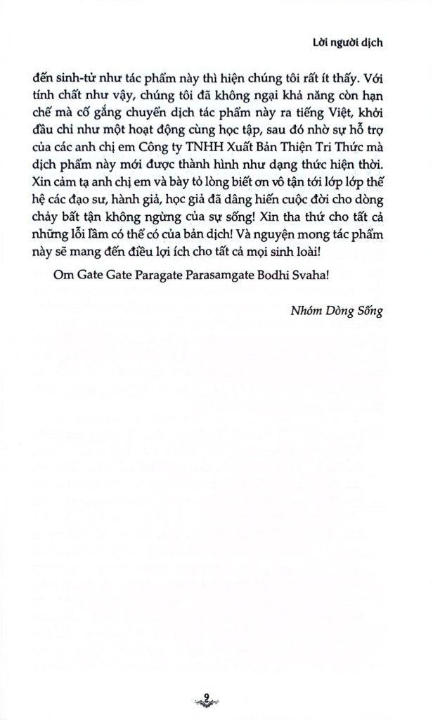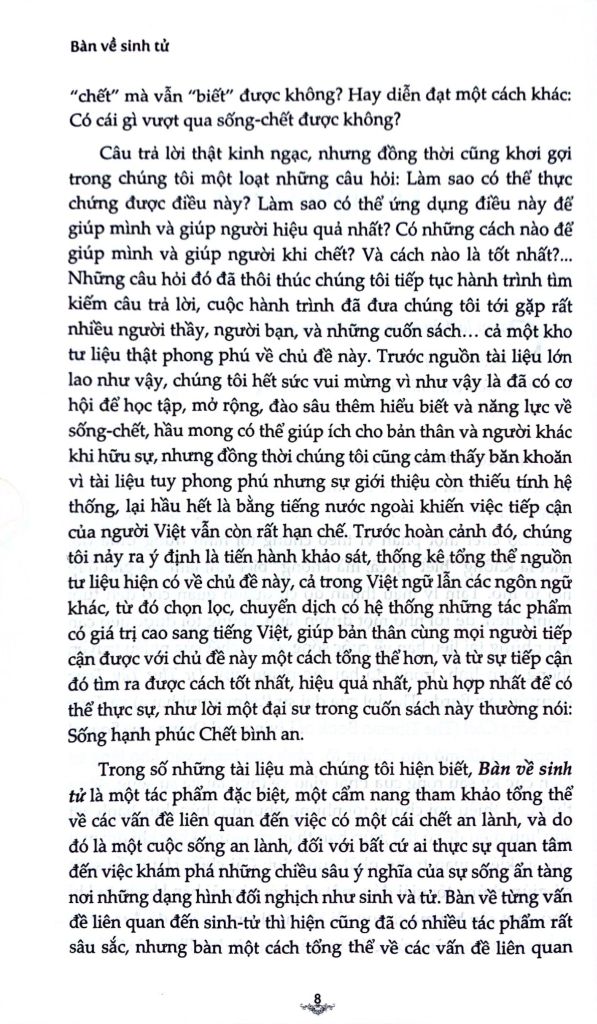 Câu trả lời thật kinh ngạc, nhưng đồng thời cũng khơi gợi trong chúng tôi một loạt những câu hỏi: Làm sao có thể thực chứng được điều này? Làm sao có thể ứng dụng điều này để giúp mình và giúp người hiệu quả nhất? Có những cách nào để giúp mình và giúp người khi chết? Và cách nào là tốt nhất?... Những câu hỏi đó đã thôi thúc chúng tôi tiếp tục hành trình tìm kiếm câu trả lời, cuộc hành trình đã đưa chúng tôi tới gặp rất nhiều người thầy, người bạn, và những cuốn sách... Trong số những tài liệu mà chúng tôi hiện biết, Bàn Về Sinh Tử là một tác phẩm đặc biệt, một cẩm nang tham khảo tổng thể về các vấn đề liên quan đến việc có một cái chết an lành, và do đó là một cuộc sống an lành, đối với bất cứ ai thực sự quan tâm đến việc khám phá những chiều sâu ý nghĩa của sự sống ẩn tàng nơi những dạng hình đối nghịch như sinh và tử. Bàn về từng vấn đề liên quan đến sinh tử thì hiện cũng đã có nhiều tác phẩm rất sâu sắc, nhưng bàn một cách tổng thể về các vấn đề liên quan đến sinh tử như tác phẩm này thì hiện chúng tôi rất ít thấy. Với tính chất như vậy, chúng tôi đã không ngại khả năng còn hạn chế mà cố gắng chuyển dịch tác phẩm này ra tiếng Việt, khởi đầu chỉ như một hoạt động cùng học tập, sau đó nhờ sự hỗ trợ của các anh chị em Công ty TNHH Xuất Bản Thiện Tri Thức mà dịch phẩm này mới được thành hình như dạng thức hiện thời. Xin cảm tạ anh chị em và bày tỏ lòng biết ơn vô tận tới lớp lớp thế hệ các đạo sư, hành giả, học giả đã dâng hiến cuộc đời cho dòng chảy bất tận không ngừng của sự sống! Xin tha thứ cho tất cả những lỗi lầm có thể có của bản dịch! Và nguyện mong tác phẩm này sẽ mang đến điều lợi ích cho tất cả mọi sinh loài!