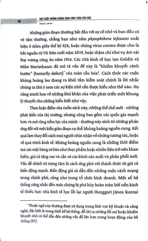 Dựa trên khung lý thuyết tổng quát, Giáo sư Harold James, một chuyên gia hàng đầu người Mỹ trong lĩnh vực nghiên cứu Lịch sử kinh tế và quan hệ quốc tế, đã phân tích một số cuộc khủng hoảng toàn cầu trong lịch sử cận hiện đại qua cuốn sách ” Bảy cuộc khủng hoảng định hình toàn cầu hóa” . Cuốn sách bao gồm 7 chương, trong đó tác giả nghiên cứu các cuộc khủng hoảng lớn từ thế kỷ XIX đến nay, gồm khủng hoảng cuối thập niên 1840, cú sốc cung-cầu đồng thời trên thị trường chứng khoán năm 1873, thời kỳ Đại Suy thoái 1929 -1933, cuộc khủng hoảng tài chính toàn cầu 2007-2008 và gần đây nhất là Đại dịch Covid-19.
