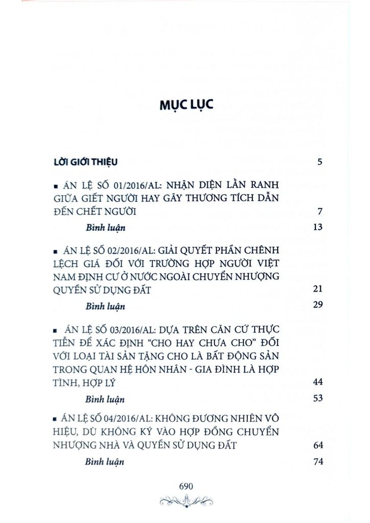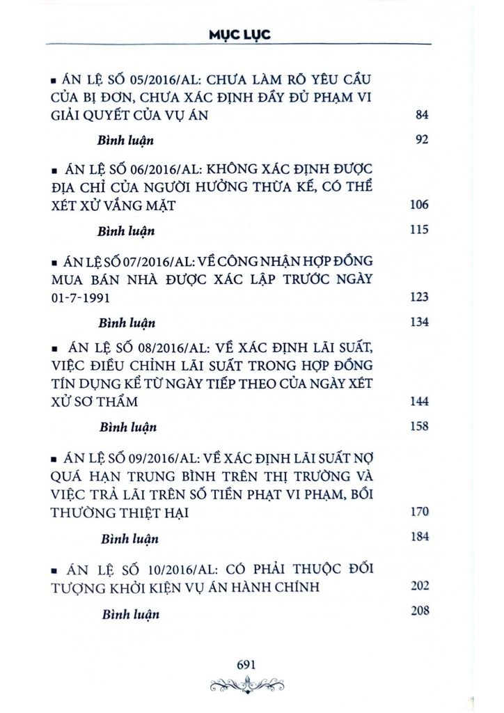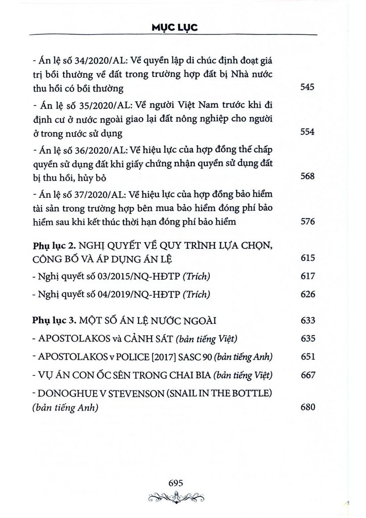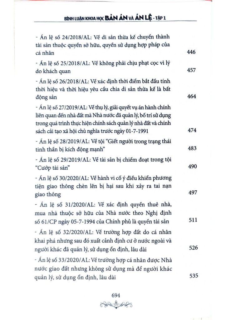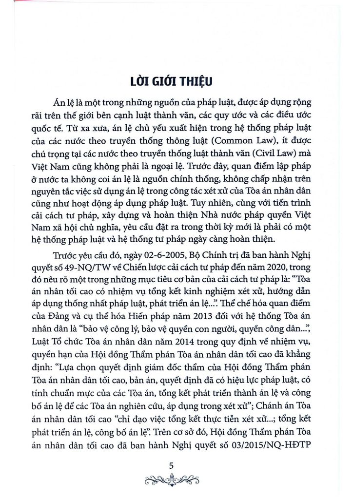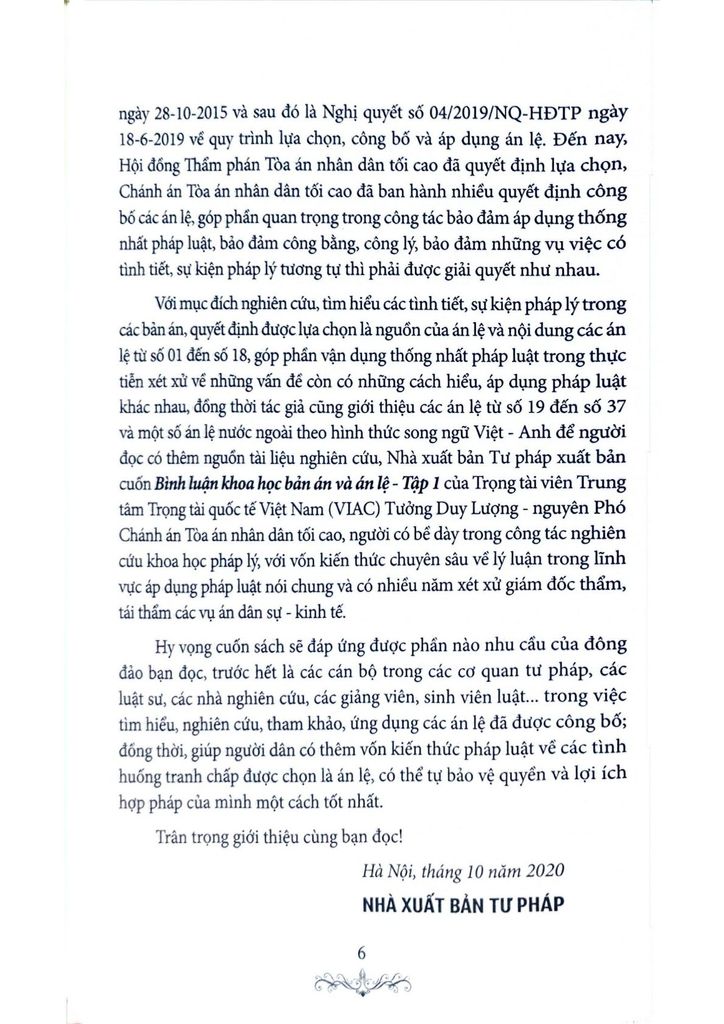 Hy vọng cuốn sách sẽ đáp ứng được phần nào nhu cầu của đông đảo bạn đọc, trước hết là các cán bộ trong các cơ quan tư pháp, các luật sư, các nhà nghiên cứu, các giảng viên, sinh viên luật… trong việc tìm hiểu, nghiên cứu, tham khảo, ứng dụng các án lệ đã được công bố; đồng thời, giúp người dân có thêm vốn kiến thức pháp luật về các tình huống tranh chấp được chọn là án lệ, có thể tự bảo vệ quyền và lợi ích hợp pháp của mình một cách tốt nhất.