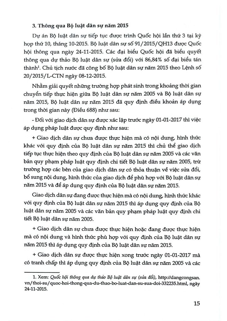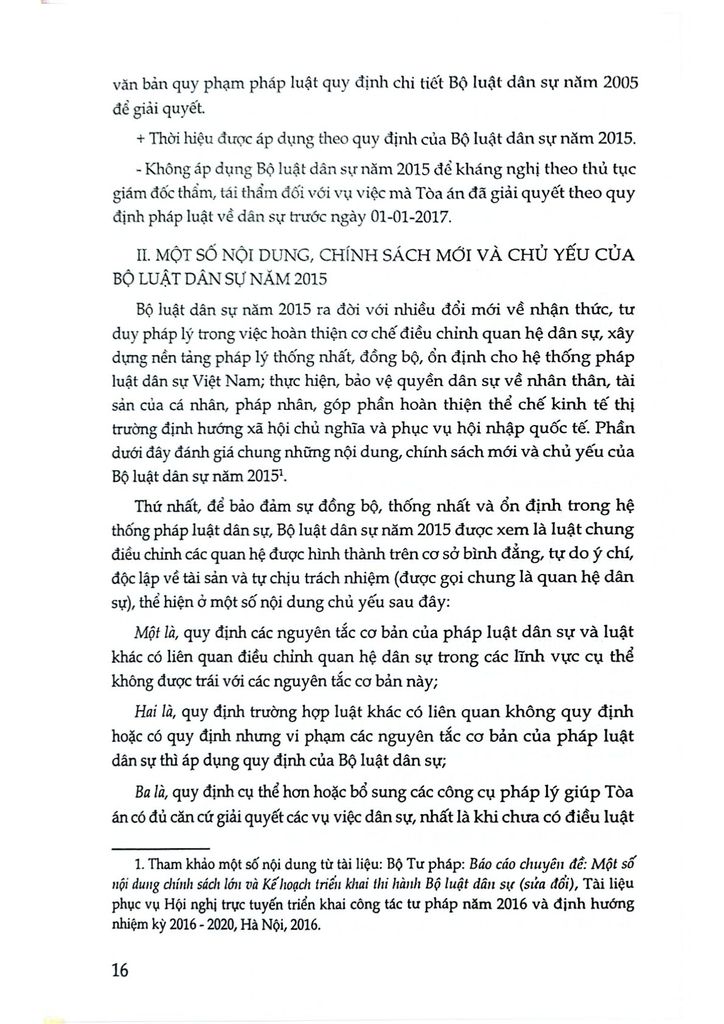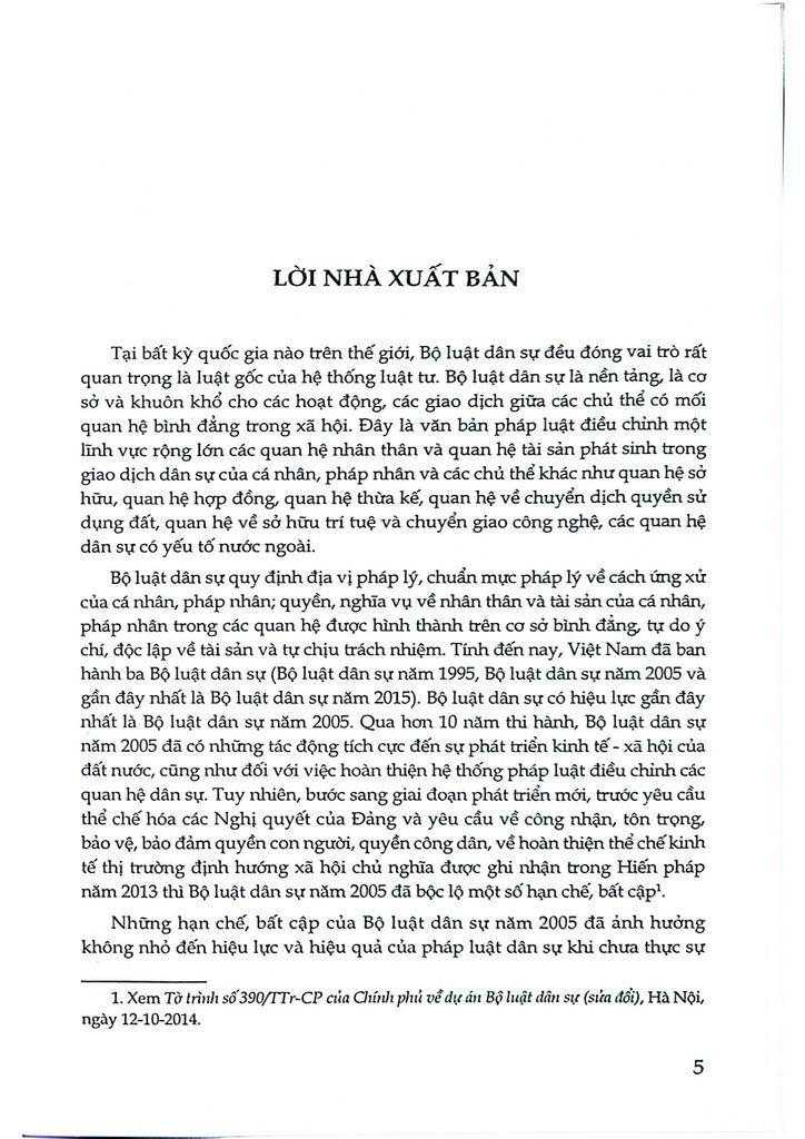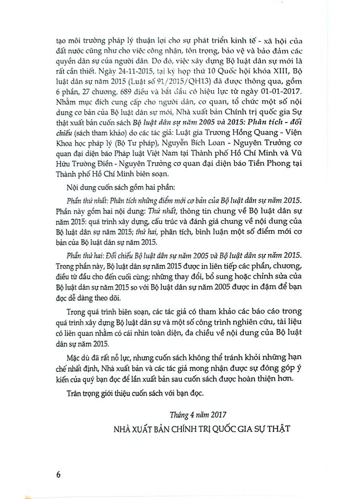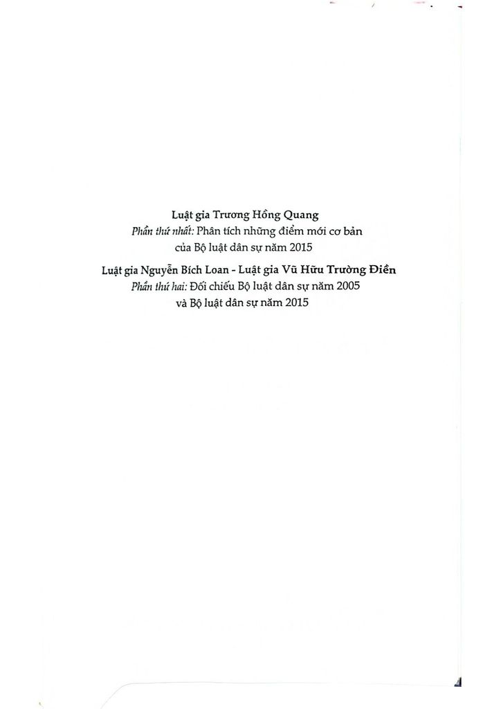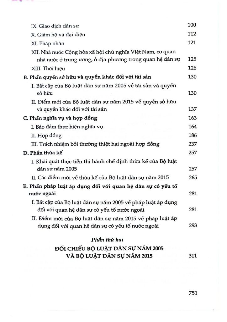 Phần thứ hai: Đối chiếu Bộ luật dân sự năm 2005 và Bộ luật dân sự năm 2015. Trong phần này, Bộ luật dân sự năm 2015 được in liên tiếp các phần, chương, điều từ đầu cho đến cuối cùng; những thay đổi, bổ sung hoặc chỉnh sửa của Bộ luật dân sự năm 2015 so với Bộ luật dân sự năm 2005 được in đậm để bạn đọc dễ dàng theo dõi.
