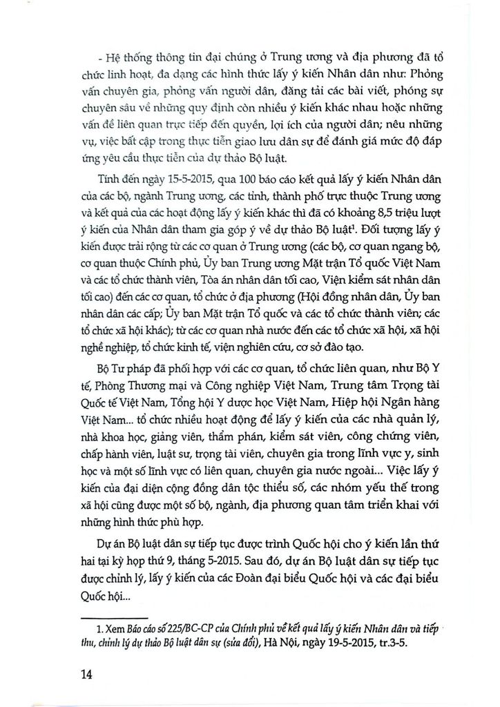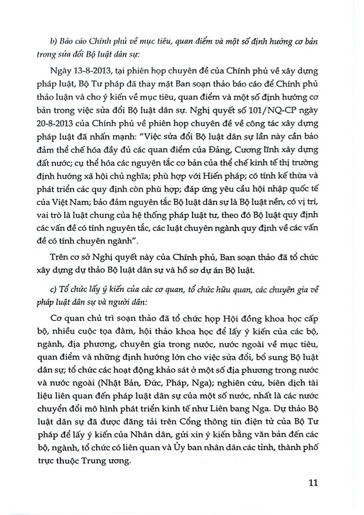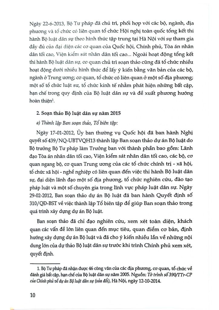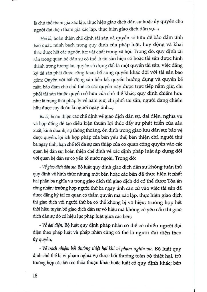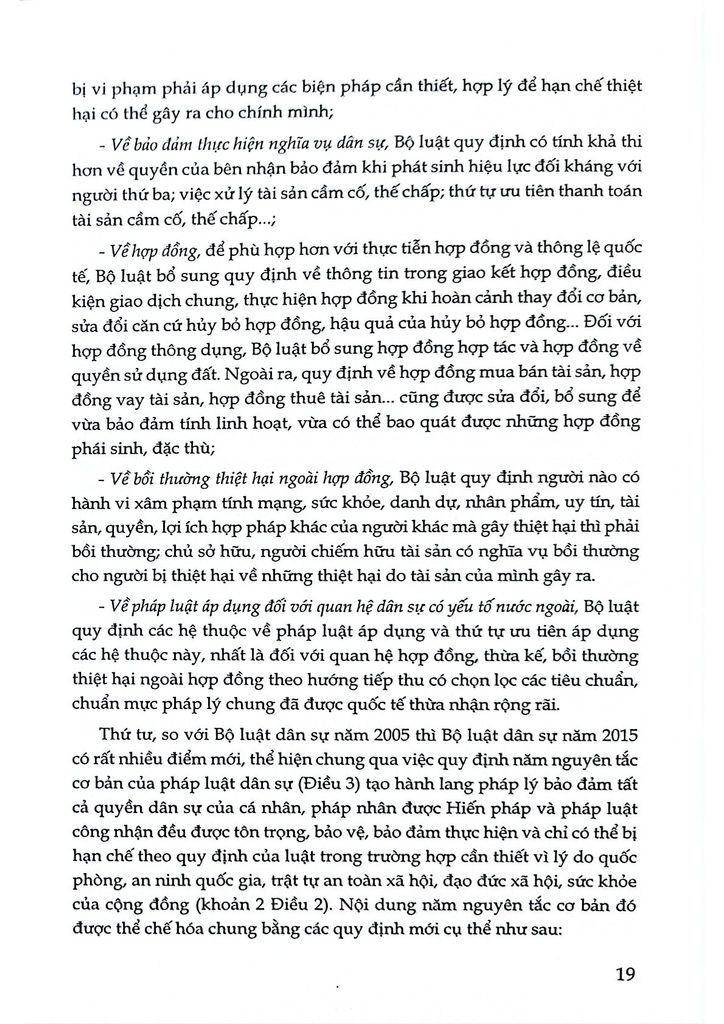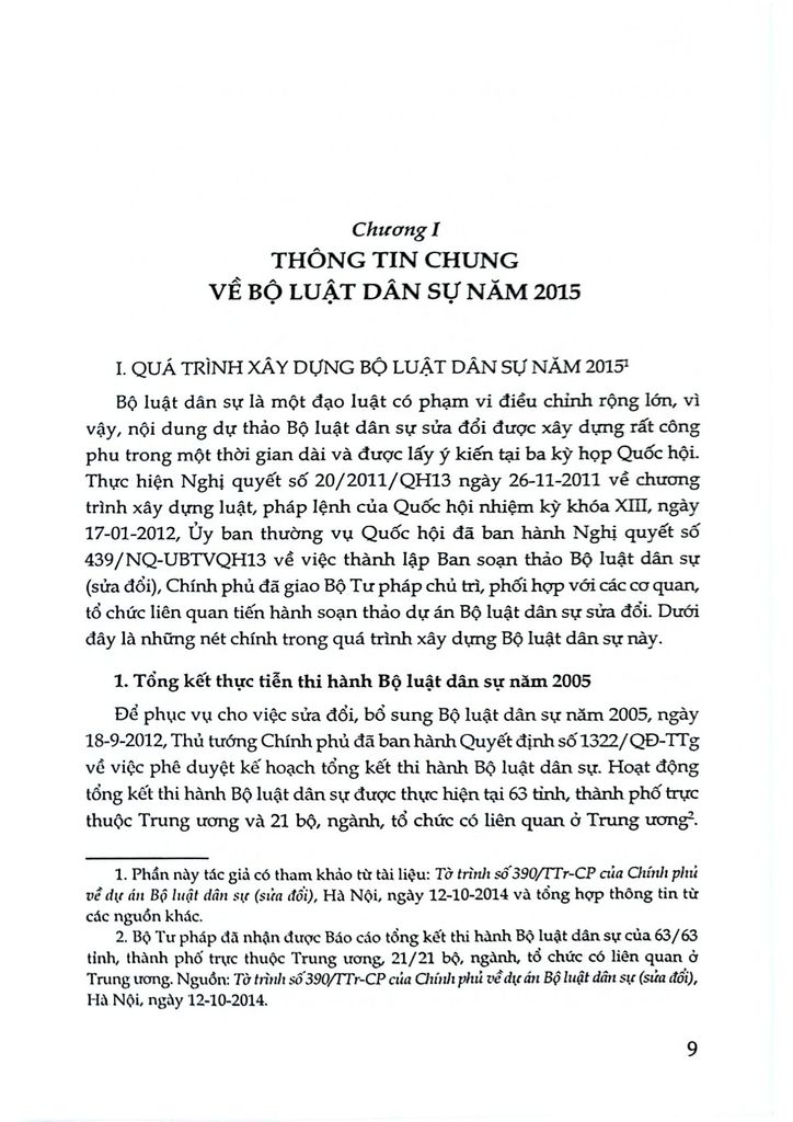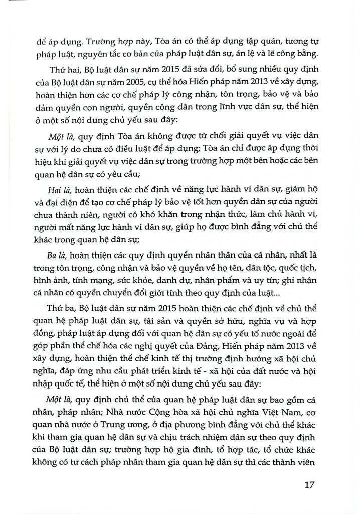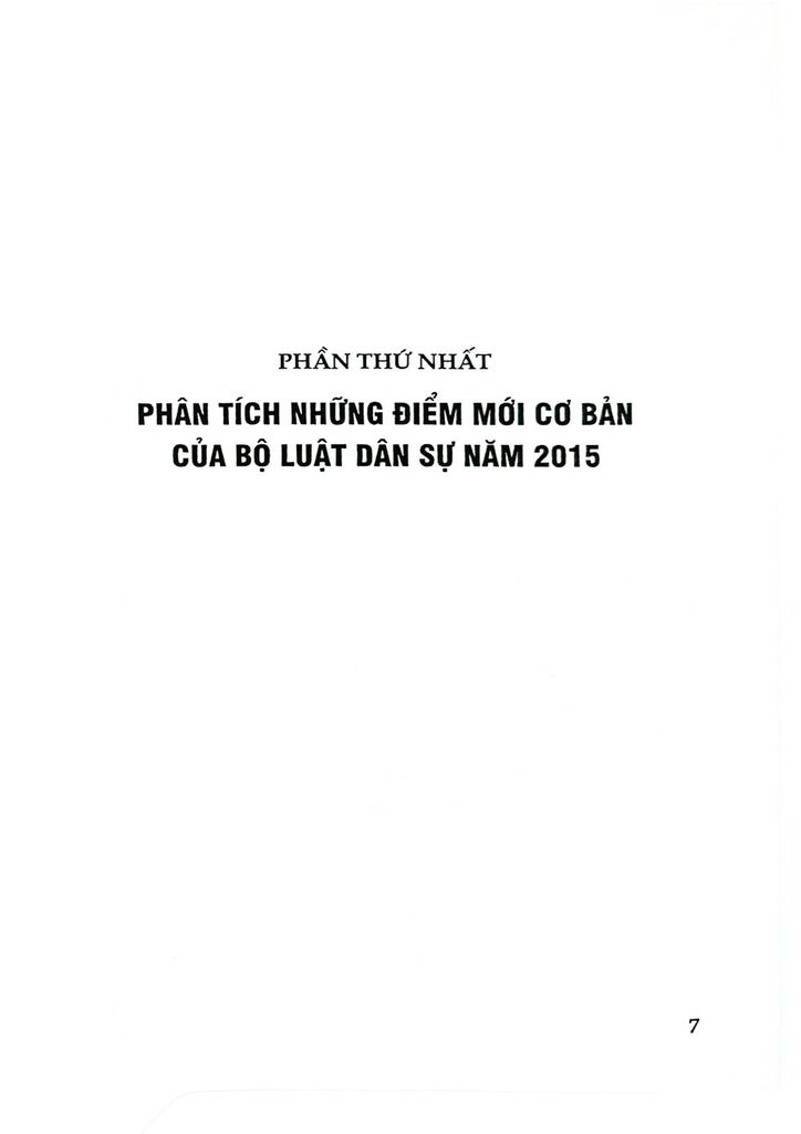Phần thứ nhất: Phân tích những điểm mới cơ bản của Bộ luật dân sự năm 2015. Phần này gồm hai nội dung: Thứ nhất, thông tin chung về Bộ luật dân sự năm 2015: quá trình xây dựng, cấu trúc và đánh giá chung về nội dung của Bộ luật dân sự năm 2015; thứ hai, phân tích, bình luận một số điểm mới cơ bản của Bộ luật dân sự năm 2015.