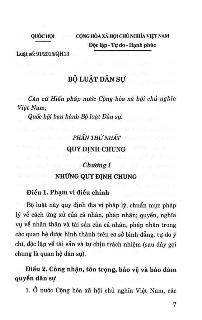 Với 6 phần, 27 chương và 689 điều, Bộ luật Dân sự 2015 điều chỉnh hầu hết các quan hệ dân sự: từ hợp đồng, tài sản, thừa kế, quyền sở hữu, nghĩa vụ và trách nhiệm bồi thường, cho đến giao dịch dân sự, quyền nhân thân… Tất cả đều được xây dựng trên nguyên tắc bình đẳng, tự do ý chí và tự chịu trách nhiệm giữa các bên.