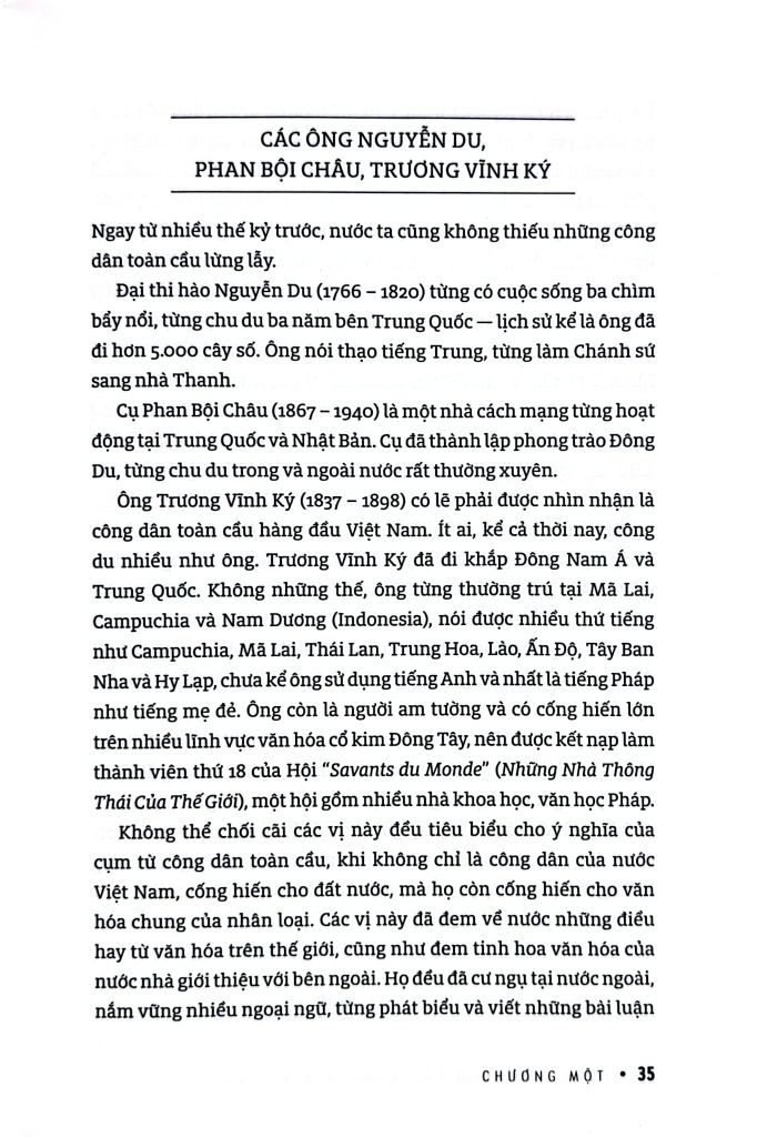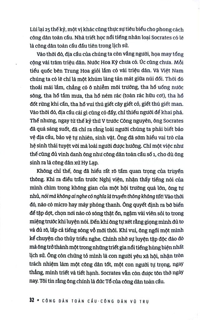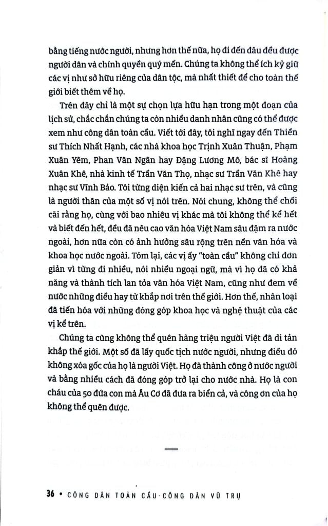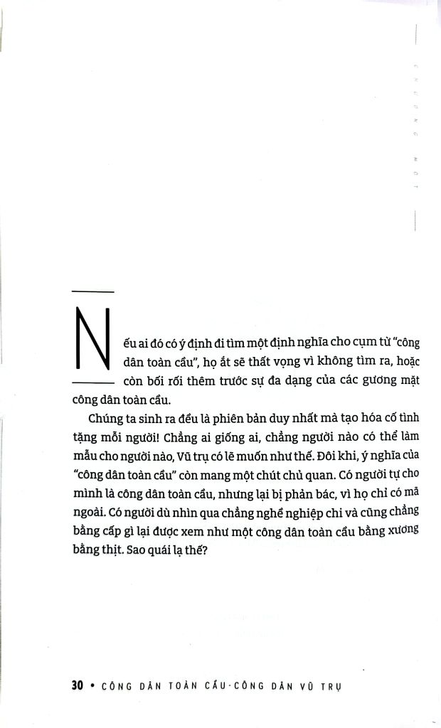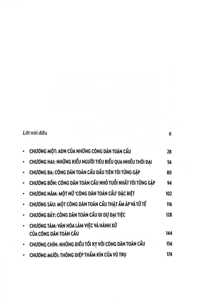 Những "công dân toàn cầu" mang những nét đặc trưng nào? Họ có sinh hoạt, làm việc, và hành xử theo các chuẩn mực khác biệt của riêng một cộng đồng mang đẳng cấp cao? Liệu có những hình mẫu nào để chúng ta tham khảo, từ đó tự rèn cho mình phong thái của một "công dân toàn cầu"? Và xa hơn nữa, một công dân của Vũ trụ? Bằng cách mô tả vừa rộng vừa sâu, vừa bao quát nhưng vẫn cung cấp nhiều ví dụ cụ thể, tác giả Phan Văn Trường mang đến một cách nhìn mới mẻ và sâu sắc về hình ảnh của những con người yêu thương đồng loại, trách nhiệm với địa cầu, và trân quý Vũ trụ mà chúng ta đang sống.