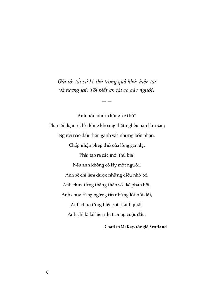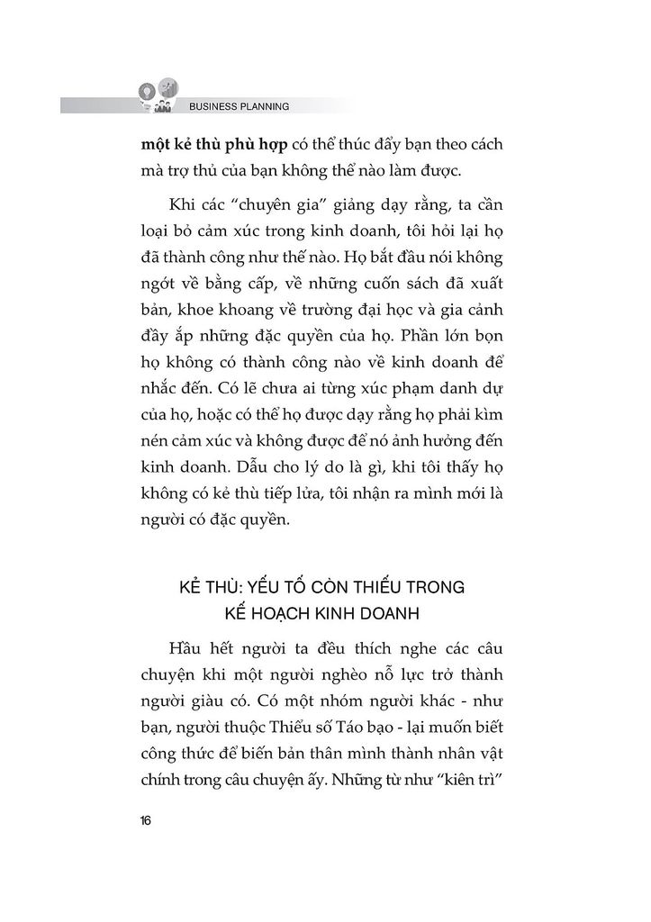 Một điểm nhấn đặc biệt trong cuốn sách là khái niệm "chọn kẻ thù" – chọn đúng đối thủ hoặc thách thức để làm nguồn động lực cho bản thân. Kẻ thù ở đây không phải là ai đó để ganh đua, mà là yếu tố giúp bạn duy trì sự tập trung và sục sôi quyết tâm tiến về phía trước.