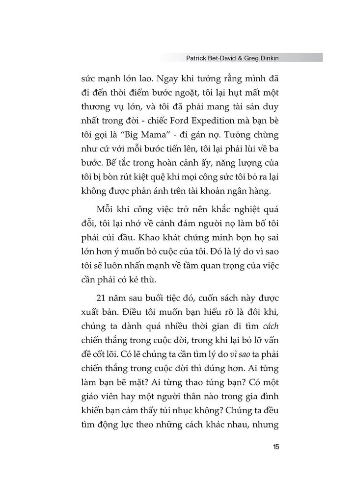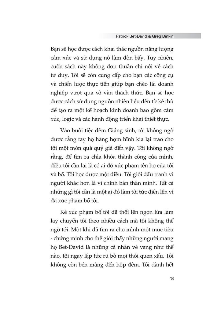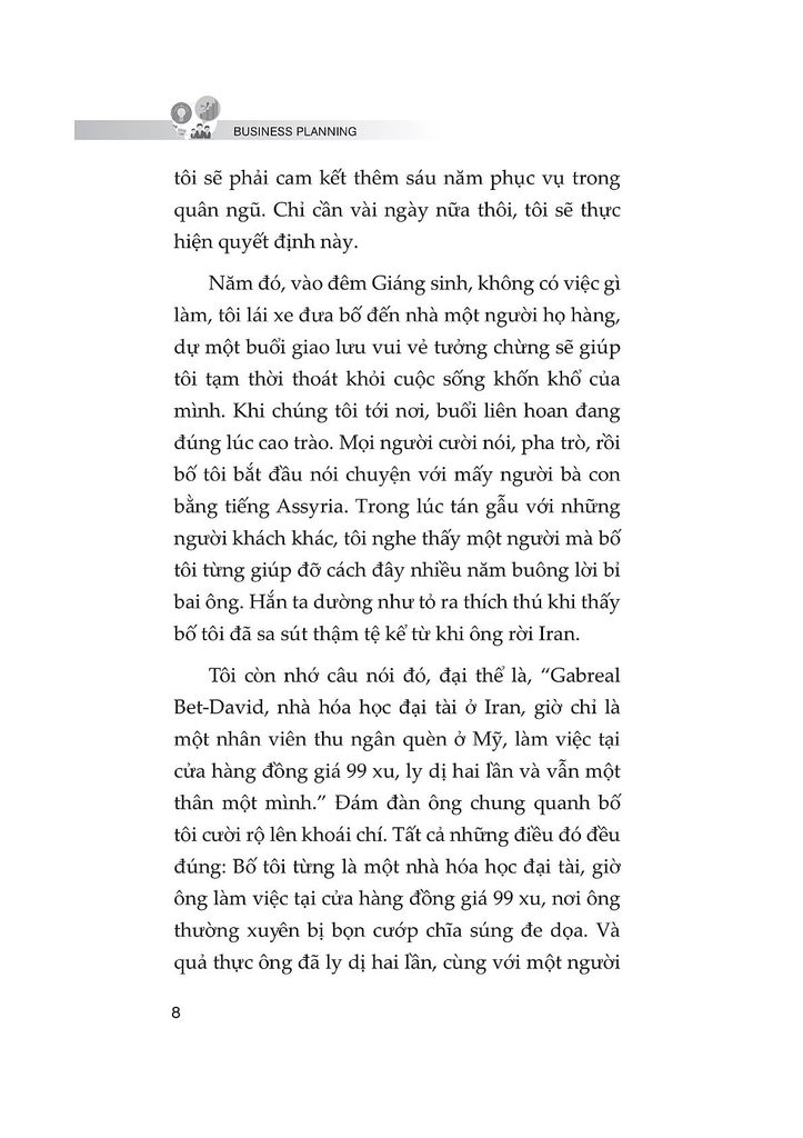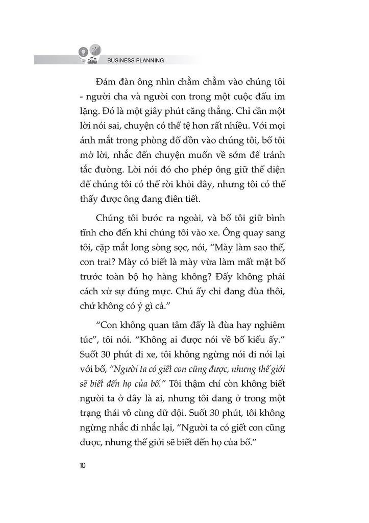 Trong cuốn “Business Planning: Phương pháp lập kế hoạch kinh doanh chi tiết và hiệu quả”, tác giả Patrick Bet-David hướng dẫn cách khai thác sức mạnh cảm xúc để xây dựng một kế hoạch kinh doanh vừa thực tế, vừa mang lại động lực lớn lao. Cuốn sách tập trung vào việc biến những khát khao thành chiến lược phát triển doanh nghiệp, tạo nên sự tăng trưởng bền vững qua nhiều thế hệ.