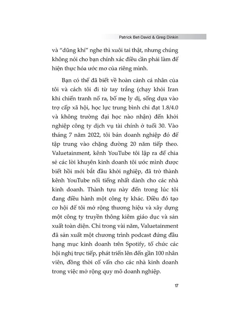 Tác giả Patrick Bet-David đã dành nhiều năm phát triển hệ thống 12 nền tảng cốt lõi giúp doanh nghiệp đạt được thành công vượt trội. Ông chia sẻ rằng, sự kết hợp giữa cảm xúc và logic là chìa khóa giúp doanh nhân xây dựng một kế hoạch không chỉ khả thi, mà còn là nguồn năng lượng mạnh mẽ để vượt qua mọi thách thức. Cuốn sách đưa ra các bước đơn giản, dễ hiểu, nhằm giúp bạn tạo ra sự phát triển theo cấp số nhân và thành công lâu dài. Mục tiêu là giúp người đọc tìm ra cách tổ chức ý tưởng và lập nên một kế hoạch cá nhân hóa, có khả năng truyền cảm hứng cho chính mình. Bet-David nhấn mạnh rằng, việc lập kế hoạch kinh doanh chỉ yêu cầu ba yếu tố chính cần phải có: