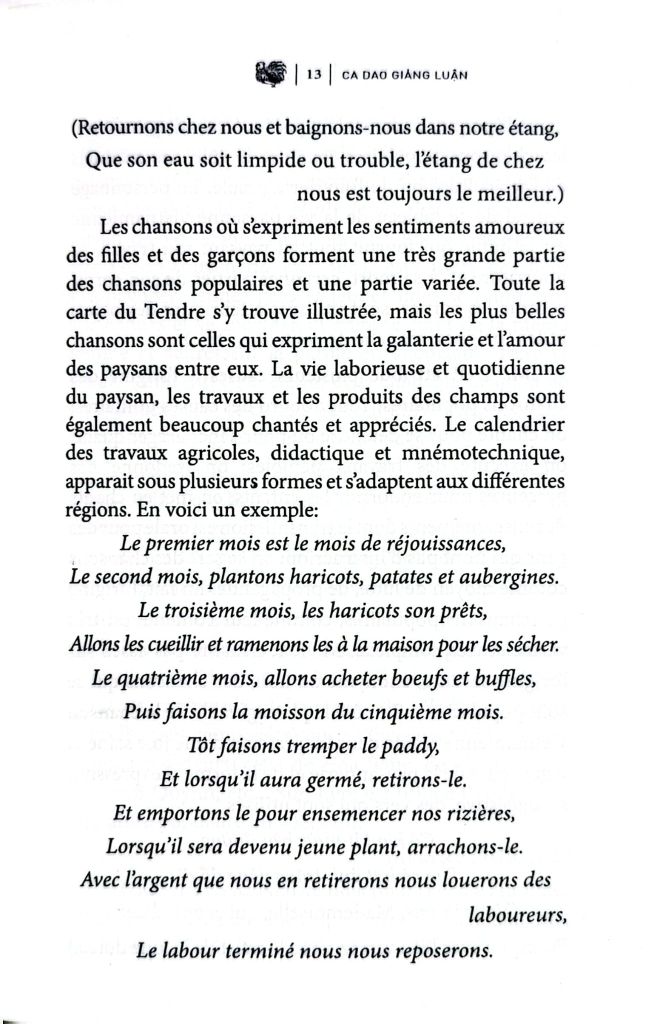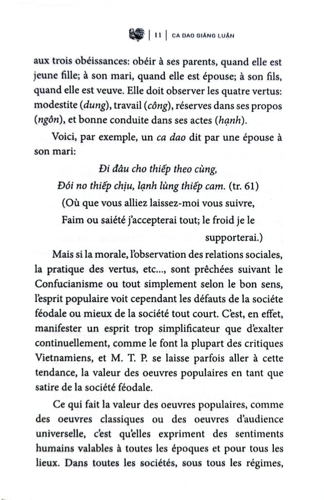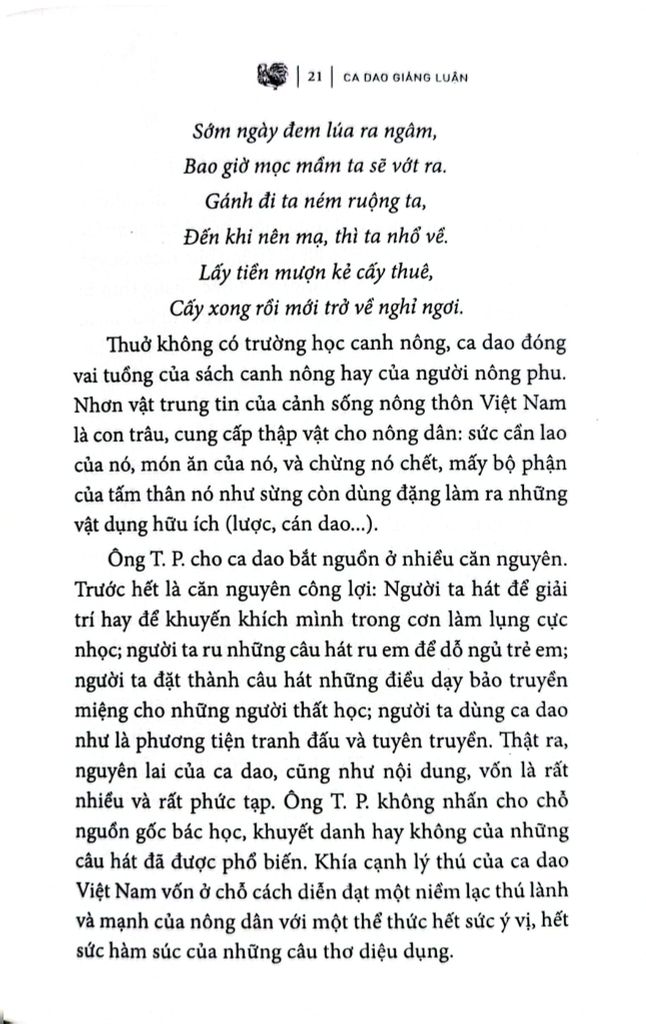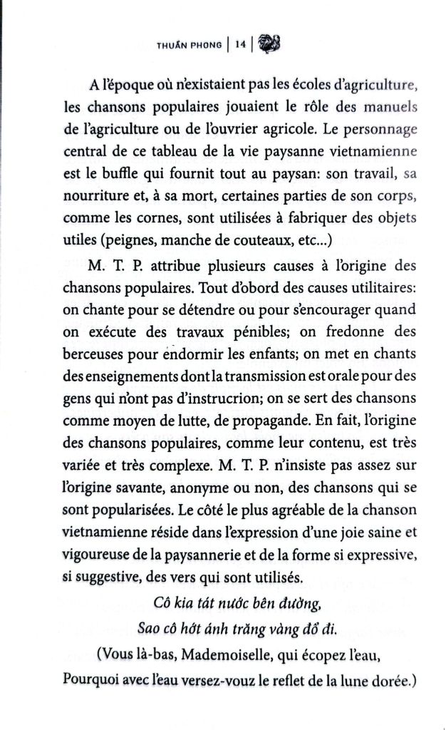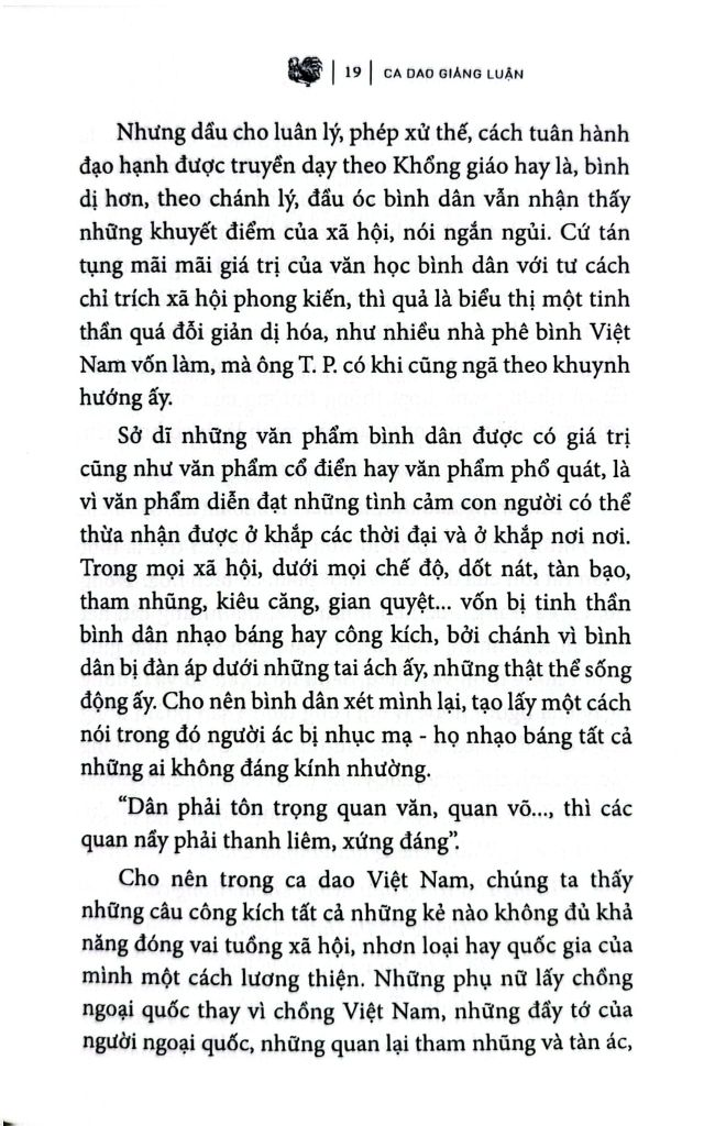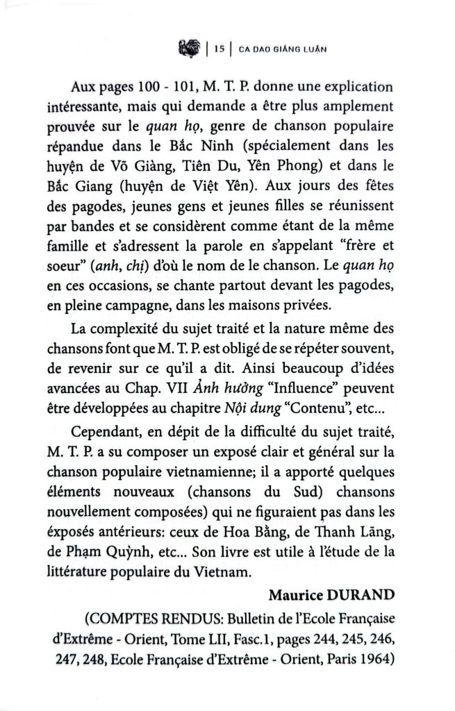 Tuy nhiên, mặc dầu đề tài khảo luận khó khăn, ông T. P. đã biết kết cấu một thiên trình giải minh bạch và tổng quát về Dân ca Việt Nam, ông có cống hiến thêm vài yếu tố mới (ca dao miền Nam, ca dao mới đặt). Yếu tố mới ấy không có mặt trong những thiên trình giải trước đây của Hoa Bằng, của Thanh Lãng, của Phạm Quỳnh... Quyển sách của ông vốn hữu ích cho việc nghiên cứu văn chương bình dân của Việt Nam.