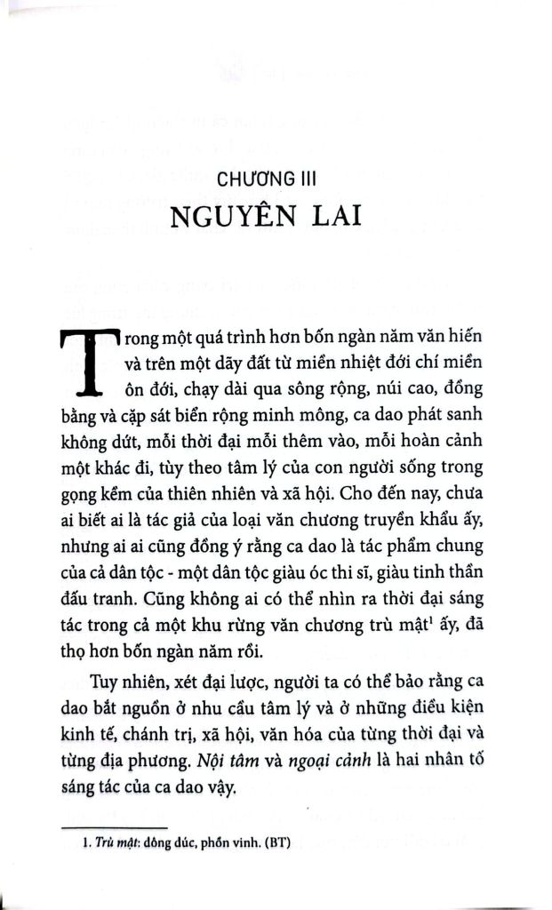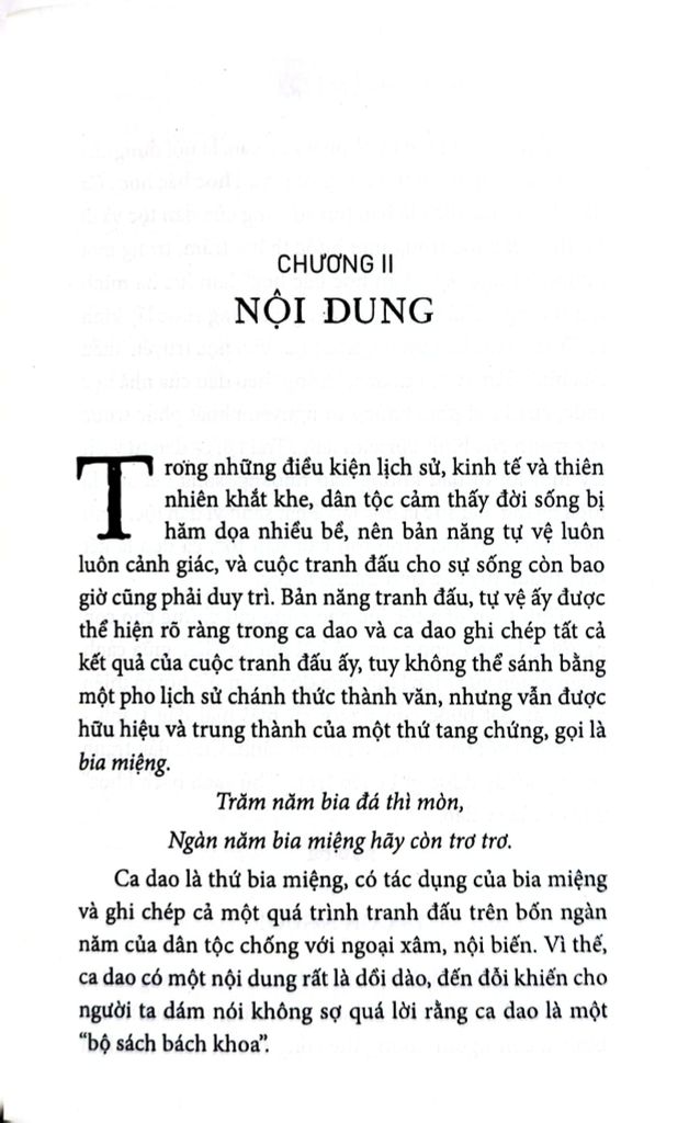 Ca dao gồm đủ ba tánh cách dân tộc, đại chúng và khoa học là ba đức tánh tất yếu của một nền học thuật chơn chánh, tự đặt lấy nhiệm vụ phụng sự dân tộc, nên trải qua một cuộc hưng vong, bao nhiều triều đại và thế hệ đã qua, vẫn còn sống mãi cùng dân tộc, phản chiếu đức tánh của dân tộc một cách trung thành.