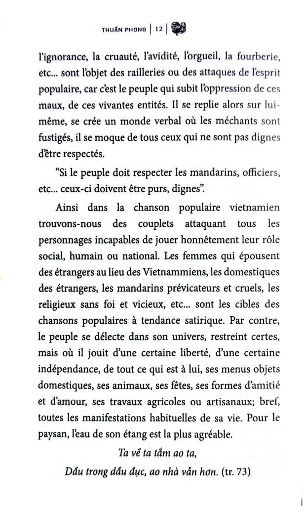 Sở dĩ những văn phẩm bình dân được có giá trị cũng như văn phẩm cổ điển hay văn phẩm phổ quát, là vì văn phẩm diễn đạt những tình cảm con người có thể thừa nhận được ở khắp các thời đại và ở khắp nơi nơi. Trong mọi xã hội, dưới mọi chế độ, dốt nát, tàn bạo, tham nhũng, kiêu căng, gian quyệt... vốn bị tinh thần bình dân nhạo báng hay công kích, bởi chánh vì bình dân bị đàn áp dưới những tai ách ấy, những thật thể sống động ấy. Cho nên bình dân xét mình lại, tạo lấy một cách nói trong đó người ác bị nhục mạ - họ nhạo báng tất cả những ai không đáng kính nhường.