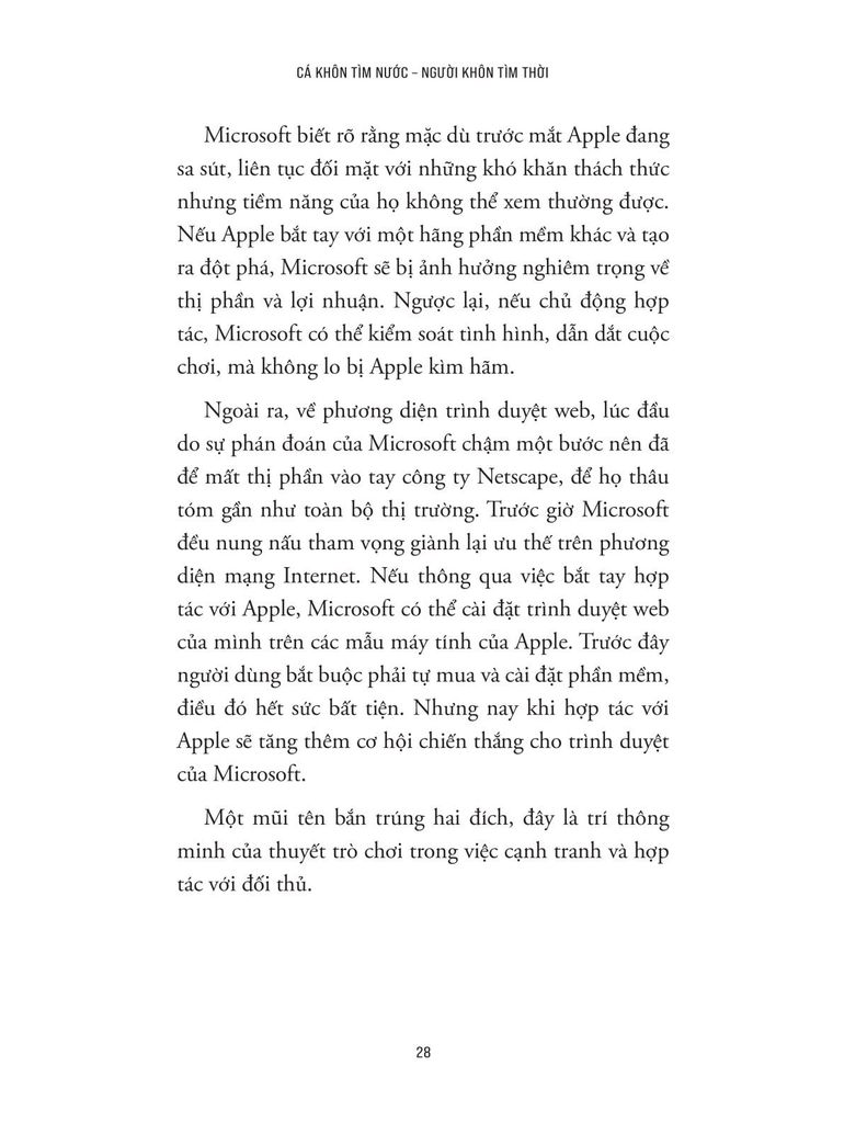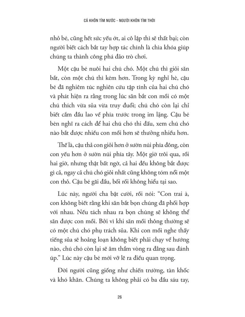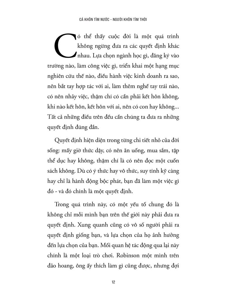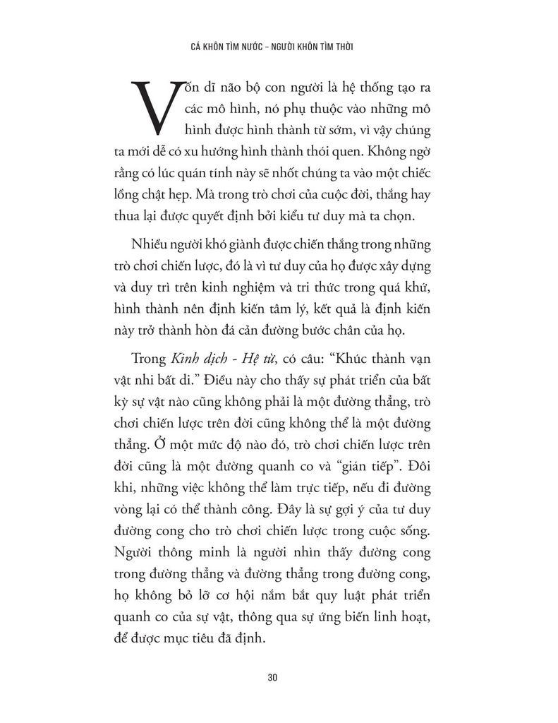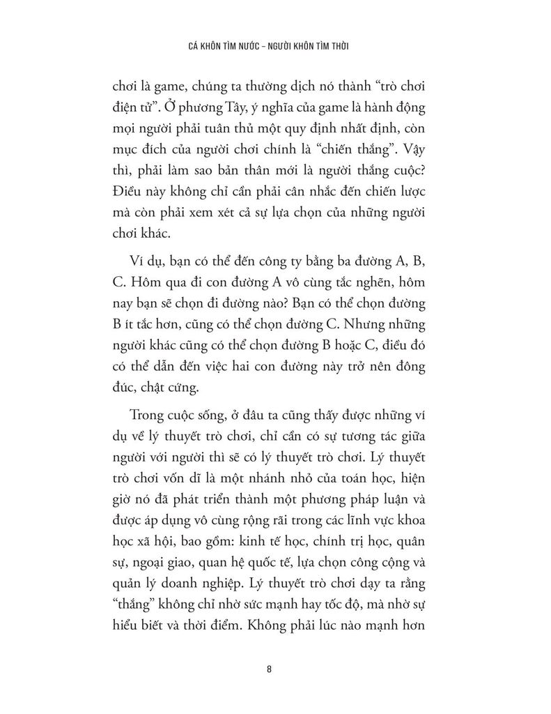 Trong cuộc sống, có những người nỗ lực rất nhiều nhưng vẫn không đạt được kết quả như mong muốn, trong khi có người dường như chỉ cần chọn đúng thời điểm và chiến lược là đã có thể đi xa hơn rất nhiều. Sự khác biệt này không chỉ nằm ở mức độ chăm chỉ hay tài năng cá nhân, mà còn nằm ở cách mỗi người hiểu và vận dụng tư duy chiến lược trong môi trường có sự cạnh tranh và tương tác với người khác. “Cá khôn tìm nước, người khôn tìm thời” chính là cuốn sách lý giải sự khác biệt ấy thông qua góc nhìn của tư duy chiến lược và lý thuyết trò chơi - một lĩnh vực quan trọng trong kinh tế học và khoa học hành vi, nghiên cứu cách con người đưa ra quyết định khi hành động của mình chịu ảnh hưởng bởi hành động của người khác.