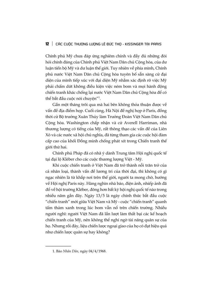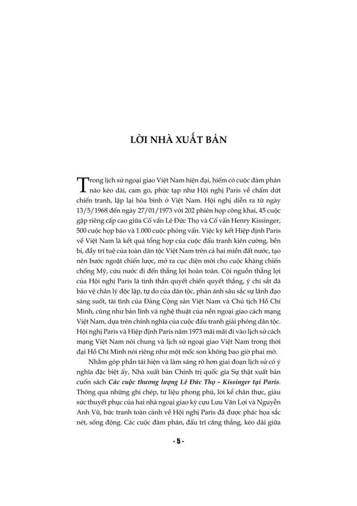 Nhằm góp phần tái hiện và làm sáng rõ hơn thời khắc lịch sử có ý nghĩa đặc biệt ấy, Nhà xuất bản Chính trị quốc gia Sự thật phối hợp với Omega Plus phát hành cuốn sách “Các cuộc thương lượng Lê Đức Thọ - Kissinger tại Paris”. Thông qua những ghi chép, tư liệu phong phú, lời kể chân thực, giàu sức thuyết phục của hai nhà ngoại giao kỳ cựu Lưu Văn Lợi và Nguyễn Anh Vũ, bức tranh toàn cảnh về Hội nghị Paris đã được phác họa sắc nét, sống động. Các cuộc đàm phán, đấu trí căng thẳng, kéo dài giữa Cố vấn đặc biệt Lê Đức Thọ và Cố vấn An ninh quốc gia Mỹ Henry Kissinger được kể lại theo tiến trình thời gian, qua đó làm nổi bật âm mưu, chiến lược của phía Mỹ, đồng thời làm rõ quan điểm, sách lược và bản lĩnh ứng xử linh hoạt, kiên định của ta.