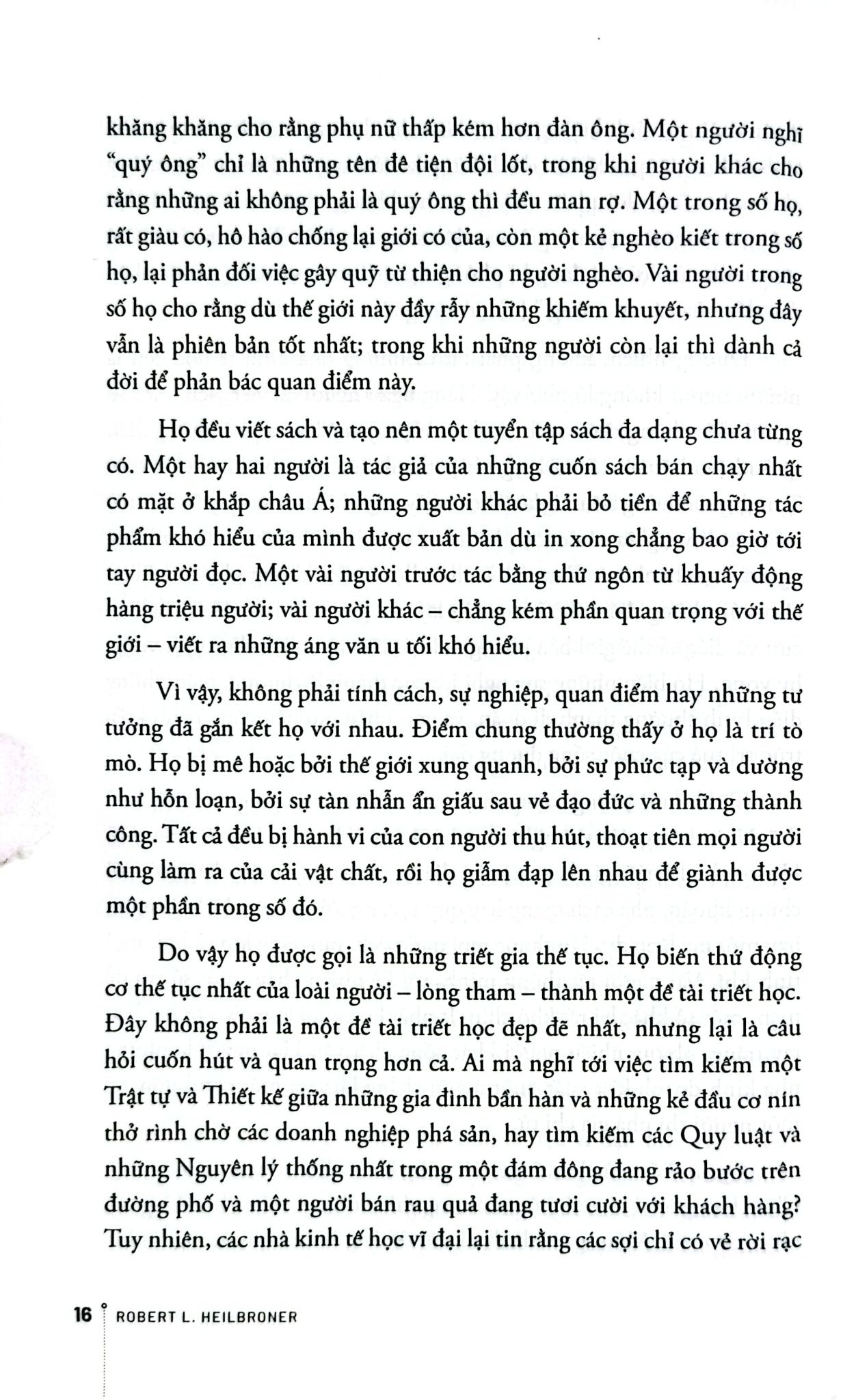 Cuốn sách được xuất bản năm 1953, đã bán gần 4 triệu bản trên khắp thế giới, “Các triết gia thế tục - Cuộc đời, thời đại và tư tưởng của các nhà kinh tế vĩ đại” của Robert L. Heilbroner là cuốn sách về một số người đã nổi danh một cách kỳ lạ. Đó là những nhà kinh tế học vĩ đại, nhưng kỳ lạ là chúng ta lại biết rất ít về họ.
