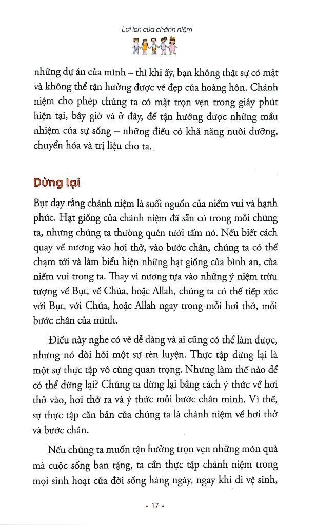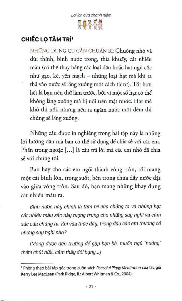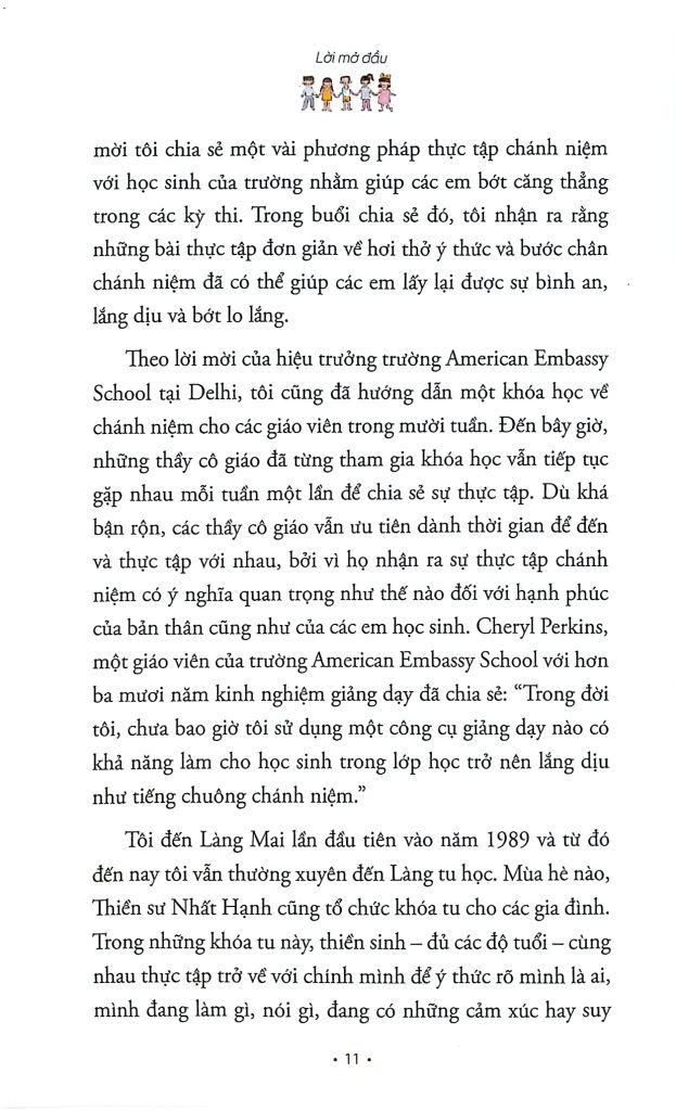 Cuốn sách này là một cuốn cẩm nang dành cho tất cả những ai muốn thực tập và chia sẻ chánh niệm với trẻ em. Để có thể chia sẻ từ kinh nghiệm của chính mình, chúng ta cần thực tập trước tiên. Nếu chúng ta áp dụng những phương pháp thực tập trong cuốn sách này với gia đình và trẻ em trong cộng đồng nơi chúng ta ở thì cả trẻ em và người lớn đều được hưởng năng lượng bình an, tươi vui và hòa điệu mà sự thực tập mang lại.