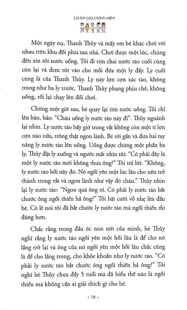 Chừng một giờ sau, bé quay lại tìm nước uống. Tôi chỉ lên bàn, bảo: “Cháu uống ly nước táo này đi”. Thủy ngoảnh lại nhìn. Ly nước táo bấy giờ trong vắt không còn một tí lợn cợn nào nữa, trông thật ngon lành. Nó tới gần và đưa hai tay nâng ly nước táo lên uống. Uống được chừng một phần ba ly, Thủy đặt ly xuống và ngước mắt nhìn tôi: "Có phải đây là một ly nước táo mới không thưa ông?" Tôi trả lời: "Không, ly nước táo hồi nãy đó. Nó ngồi yên một lúc lâu cho nên trở thành trong vắt và ngon lành như vậy đó cháu." Thủy nhìn lại ly nước táo: "Ngon quá ông ơi. Có phải ly nước táo bắt chước ông ngồi thiền không hả ông?” Tôi bật cười vỗ nhẹ lên đầu nó. Có lẽ nói rằng tôi đã bắt chước ly nước táo mà ngồi thiền thì đúng hơn.