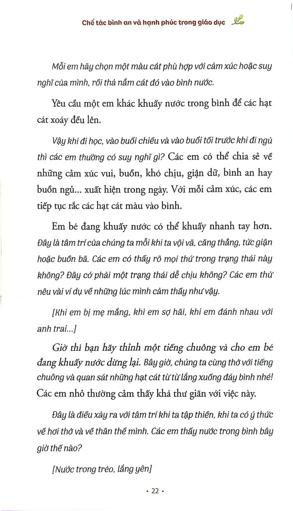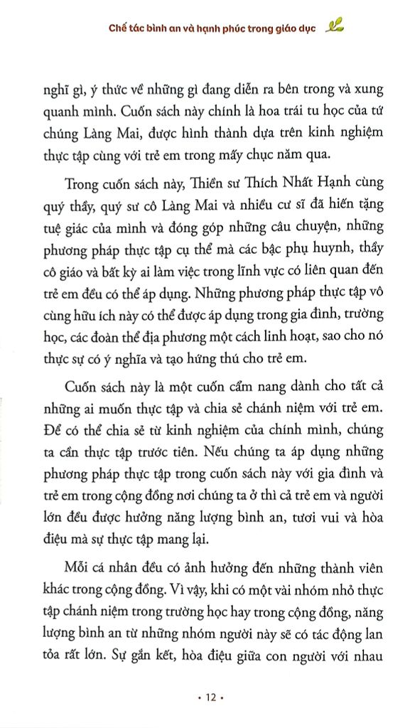 Trong cuốn sách này, Thiền sư Thích Nhất Hạnh cùng quý thầy, quý sư cô Làng Mai và nhiều cư sĩ đã hiến tặng tuệ giác của mình và đóng góp những câu chuyện, nhữngphương pháp thực tập cụ thể mà các bậc phụ huynh, thầy cô giáo và bất kỳ ai làm việc trong lĩnh vực có liên quan đến trẻ em đều có thể áp dụng. Những phương pháp thực tập vô cùng hữu ích này có thể được áp dụng trong gia đình, trường học, các đoàn thể địa phương một cách linh hoạt, sao cho nó thực sự có ý nghĩa và tạo hứng thú cho trẻ em.