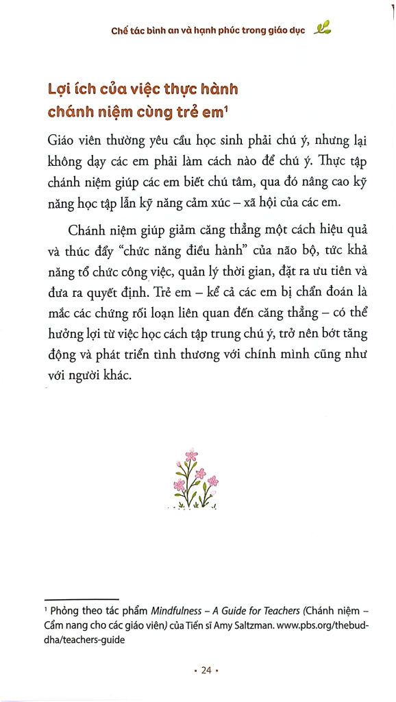 Hiện nay, vai trò của chánh niệm trong giáo dục ngày càng được công nhận một cách rộng rãi. Sự thực tập chánh niệm giúp học sinh tăng cường khả năng chú tâm, ý thức và làm chủ được các hoạt động của thân, điều phục các cảm xúc mạnh cũng như phát triển các kỹ năng giao tiếp, ứng xử trong mối liên hệ giữa mình với mọi người. Nhưng quan trọng hơn hết, chánh niệm giúp các em phát triển một cách toàn diện và lành mạnh, nuôi lớn niềm vui, sự bình an và tự tin nơi chính mình, thông qua những phương pháp thực tập làm lắng dịu căng thẳng, lo lắng và bạo động trong tự thân.