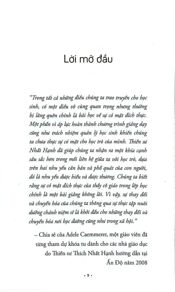 Theo lời mời của hiệu trưởng trường American Embassy School tại Delhi, tôi cũng đã hướng dẫn một khóa học về chánh niệm cho các giáo viên trong mười tuần. Đến bây giờ, những thầy cô giáo đã từng tham gia khóa học vẫn tiếp tục gặp nhau mỗi tuần một lần để chia sẻ sự thực tập. Dù khá bận rộn, các thầy cô giáo vẫn ưu tiên dành thời gian để đến và thực tập với nhau, bởi vì họ nhận ra sự thực tập chánh niệm có ý nghĩa quan trọng như thế nào đối với hạnh phúc của bản thân cũng như của các em học sinh. Cheryl Perkins, một giáo viên của trường American Embassy School với hơn ba mươi năm kinh nghiệm giảng dạy đã chia sẻ: “Trong đời tôi, chưa bao giờ tôi sử dụng một công cụ giảng dạy nào có khả năng làm cho học sinh trong lớp học trở nên lắng dịu như tiếng chuông chánh niệm.”