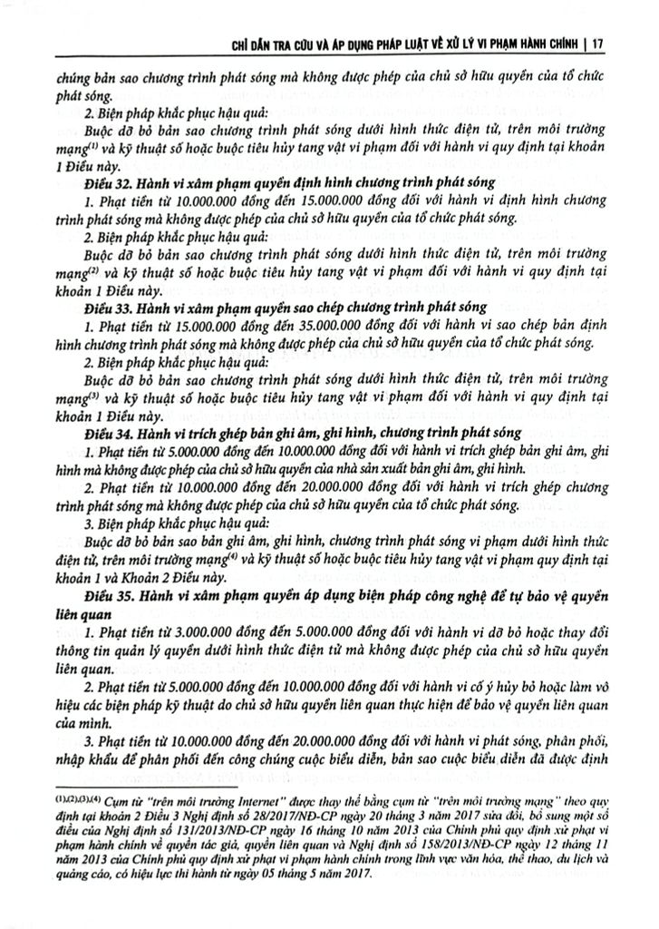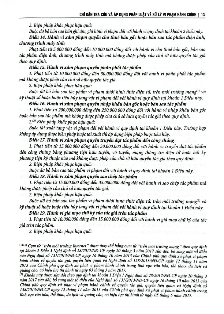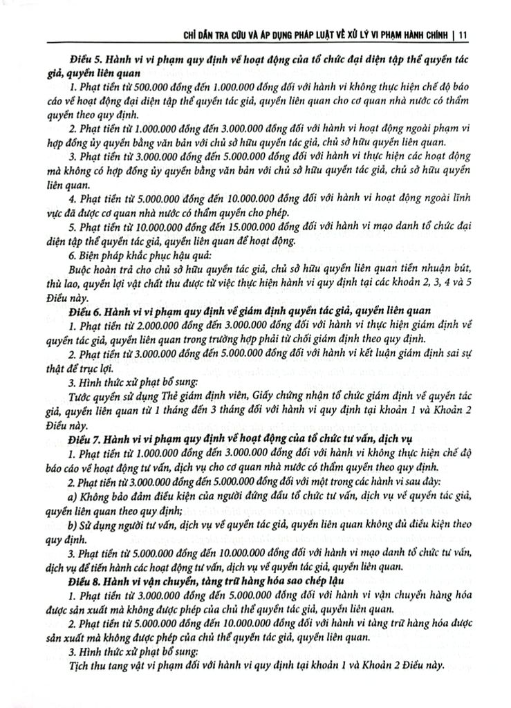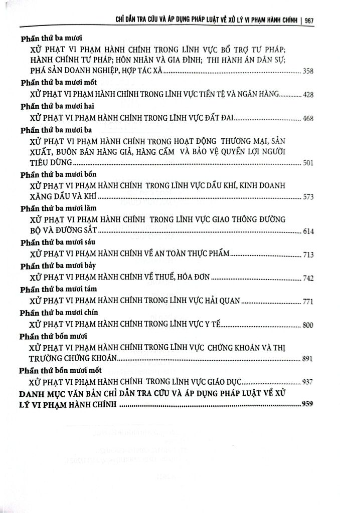 Luật xử lý vi phạm hành chính số 15/2012/QH13 ngày 20 tháng 06 năm 2012 của Quốc hội, có hiệu lực kể từ ngày 01 tháng 07 năm 2013, được sửa đổi, bổ sung bởi Luật Xử lý vi phạm hành chính năm 2021 có hiệu lực kể từ ngày 01 tháng 01 năm 2022 Để tiện tra cứu và áp dụng pháp luật về xử lý vi phạm hành chính, nhóm tác giả đã biên soạn bộ sách: "Chỉ dẫn tra cứu và áp dụng pháp luật về xử lý vi phạm hành chính (được sửa đổi, bổ sung năm 2020)", ngoài lời giới thiệu, danh mục văn bản chỉ dẫn tra cứu và áp dụng pháp luật về xử lý vi phạm hành chính, bộ sách gồm 02 phần và được chia làm 02 quyển: Phần A: Chỉ dẫn tra cứu và áp dụng pháp luật về xử lý vi phạm hành chính chung cho mọi lĩnh vực
