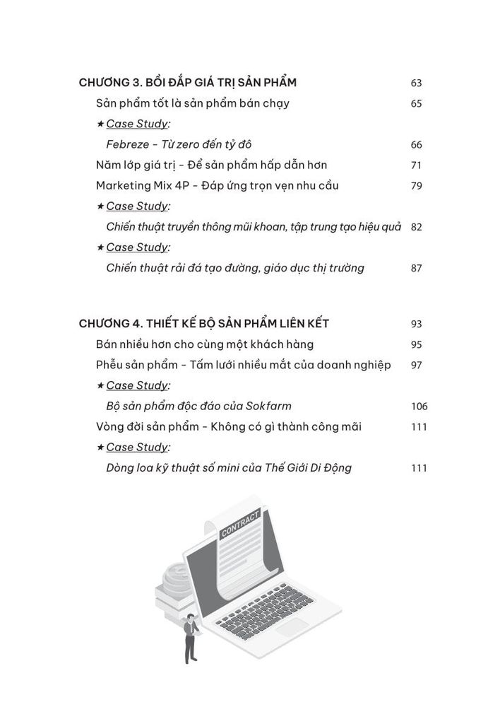 • Chương 3: Bồi đắp giá trị sản phẩm. Cấp thứ hai của tư duy sản phẩm. Tìm cách nâng cao giá trị sản phẩm, từ đó gia tăng sức hấp dẫn và sự nhận biết trên thị trường. Hai công cụ quan trọng trong chương này là mô hình Marketing Mix và mô hình năm lớp giá trị sản phẩm.