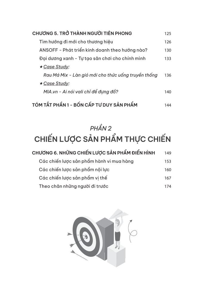 • Chương 5: Trở thành người tiên phong. Tìm kiếm cơ hội mới để trở nên độc đáo và dẫn đầu thị trường, bạn sẽ trở sở hữu riêng cho mình một thị trường rộng mở. Hai công cụ quan trọng trong chương này là tư duy đại dương xanh và ma trận Ansoff.