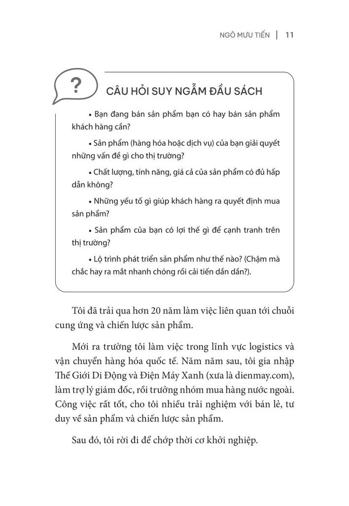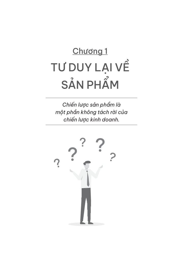 • Chương 1: Tư duy lại về sản phẩm. Chiến lược sản phẩm có ở khắp mọi nơi, chúng ta vẫn áp dụng nó thường ngày chỉ là không nhận ra điều đó. Trong chương này, chúng ta sẽ cùng xét lại cách nhìn nhận sản phẩm từ những bậc thấp nhất (thẩm định ý tưởng) đến bán chạy, siêu lợi nhuận và định hình thị trường.
