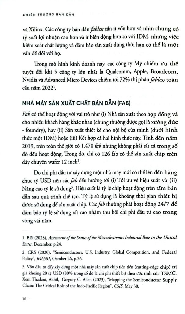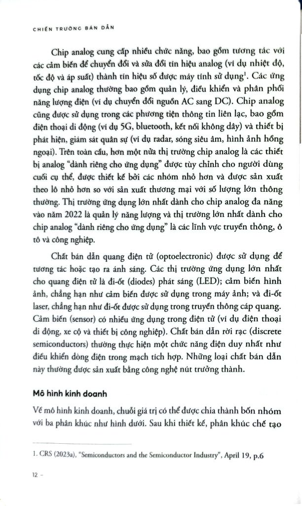 Chiến trường bán dẫn đào sâu các cách thức chạy đua giữa các quốc gia, tập đoàn, đặc biệt là hai cường quốc đối trọng Trung Quốc và Mỹ nhằm giành quyền kiểm soát thị trường bán dẫn toàn cầu. Các tác giả tiếp cận về nghiên cứu chính sách dựa trên bốn trụ cột đã đưa ra những phân tích hệ thống và cặn kẽ về những chiến lược, chính sách mà Trung Quốc và Mỹ đã áp dụng để xây dựng và củng cố vị thế cho ngành sản xuất bán dẫn của mình. Không chỉ tập trung vào những thành công rực rỡ, cuốn sách còn phân tích những thất bại và bài học lớn mà cả Mỹ và Trung Quốc đã trải qua trong hành trình 70 năm qua. Những câu chuyện về sự trỗi dậy và sụp đổ của các tập đoàn công nghệ lớn, mặc dù có sự hỗ trợ của nhà nước, là lời nhắc nhở mạnh mẽ về sự cần thiết của chiến lược dài hạn, tầm nhìn xa và sự đầu tư liên tục vào nghiên cứu và phát triển.