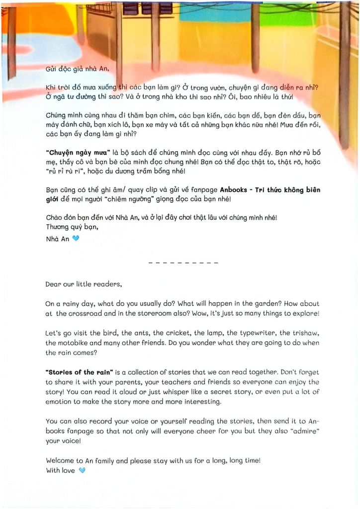 Bộ sách “Chuyện ngày mưa – Story of the rain” không chỉ được tác giả - cô Mai Thị Việt Thắng tặng cho ba bạn nhỏ Mai, An, Khang (các con của cô), mà còn dành tặng cho tuổi thơ của tất cả các bé con, nhất là những bạn đang ở độ tuổi từ 3 – 8 tuổi.