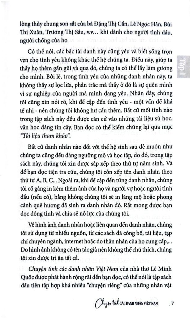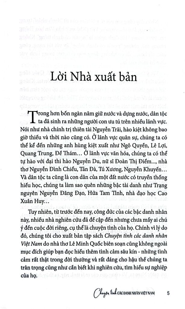 Tuy nhiên, từ trước đến nay, công đức của các bậc danh nhân này, nhiều nhà nghiên cứu đã đề cập đến nhưng chưa mấy ai chú ý đến cuộc đời riêng, cụ thể là chuyện tình của họ. Chính vì lý do đó, chúng tôi cho xuất bản tập sách Chuyện tình các danh nhân Việt Nam do nhà thơ Lê Minh Quốc biên soạn cũng không ngoài mục đích giúp bạn đọc hiểu thêm tình cảm sâu kín - những tình cảm rất thật trong đời thường và rất đáng cho hậu thế chúng ta trân trọng cũng như cần biết khi nghiên cứu, tìm hiểu sự nghiệp của họ.