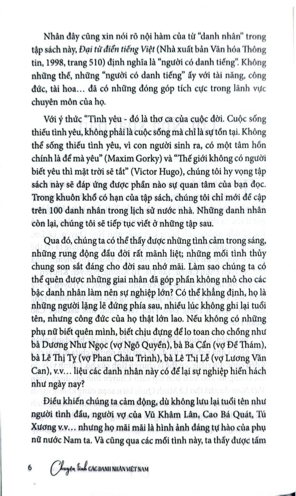 Với ý thức “Tình yêu - đó là thơ ca của cuộc đời. Cuộc sống thiếu tình yêu, không phải là cuộc sống mà chỉ là sự tồn tại. Không thể sống thiếu tình yêu, vì con người sinh ra, có một tâm hồn chính là để mà yêu” (Maxim Gorky) và “Thế giới không có người biết yêu thì mặt trời sẽ tắt” (Victor Hugo), chúng tôi hy vọng tập sách này sẽ đáp ứng được phần nào sự quan tâm của bạn đọc. Trong khuôn khổ có hạn của tập sách, chúng tôi chỉ mới đề cập trên 100 danh nhân trong lịch sử nước nhà. Những danh nhân còn lại, chúng tôi sẽ tiếp tục viết ở những tập sau.