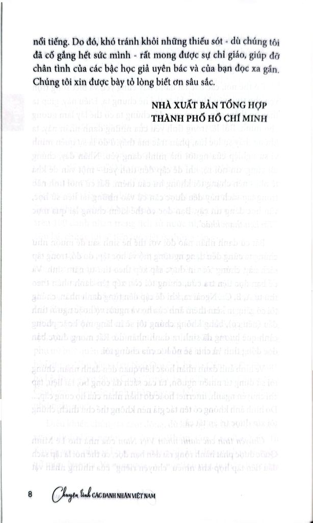 Chuyện tình các danh nhân Việt Nam của nhà thơ Lê Minh Quốc được phát hành rộng rãi đến bạn đọc, có thể nói là tập sách đầu tiên tập hợp khá nhiều “chuyện riêng” của những nhân vật nổi tiếng. Do đó, khó tránh khỏi những thiếu sót - dù chúng tôi đã cố gắng hết sức mình - rất mong được sự chỉ giáo, giúp đỡ chân tình của các bậc học giả uyên bác và của bạn đọc xa gần. Chúng tôi xin được bày tỏ lòng biết ơn sâu sắc.