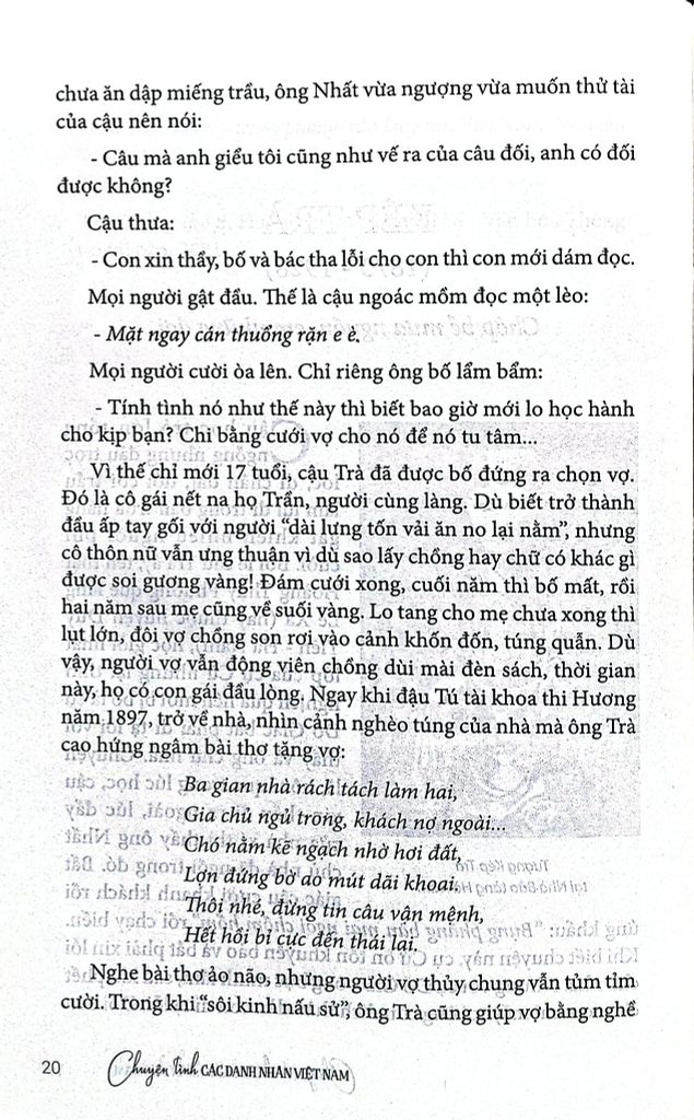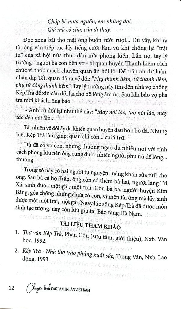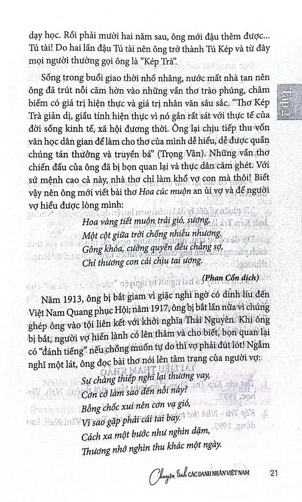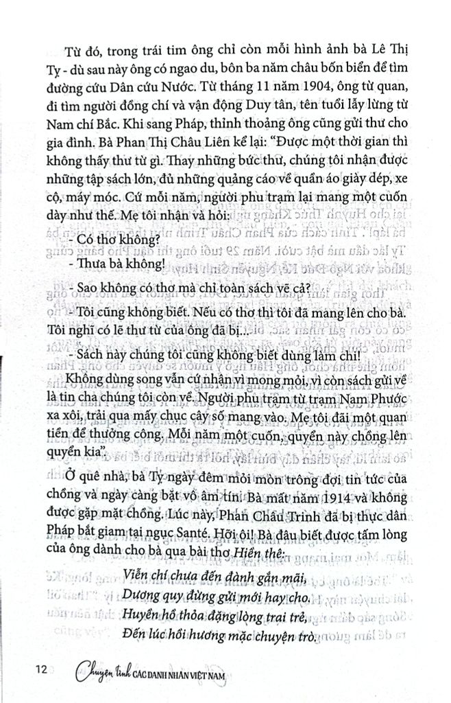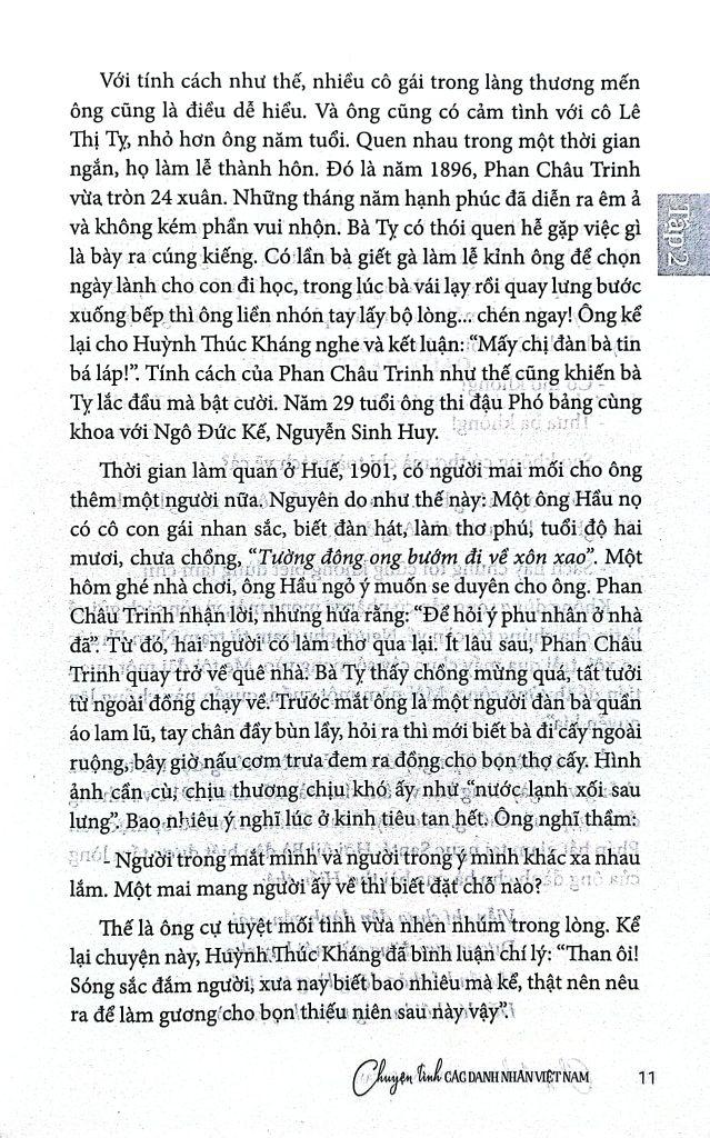 Trong lịch sử đầy biến động của đất nước và của dân tộc, mỗi số phận con người đều trải qua bao nỗi ngọt ngào và cay đắng. Đặc biệt, cuộc đời của những danh nhân - những con người có những ngôi sao chiếu mệnh lớn lao, luôn chứa đựng những mẫu số chung của muôn ngàn người khác. Đọc chuyện tình của họ, bạn đọc sẽ gặp bóng dáng cuộc đời của ông bà, cha mẹ, thậm chí của chính mình trong đó. Soi vào những tấm gương trong sáng tự ngàn xưa, mỗi chúng ta đều cảm nhận được những hương vị, những sắc màu đầy thương mến để ứng xử với hôm nay, với mai sau sao cho đẹp, cho xứng đáng với những gì mà cuộc sống đã ban tặng hôm nay.