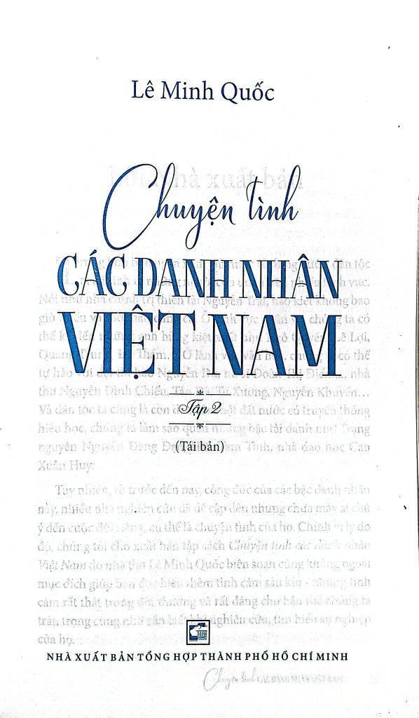 Chuyện tình các danh nhân Việt Nam của nhà thơ Lê Minh Quốc được phát hành rộng rãi đến bạn đọc, có thể nói là tập sách đầu tiên tập hợp khá nhiều “chuyện riêng” của những nhân vật nổi tiếng. Do đó, khó tránh khỏi những thiếu sót - dù chúng tôi đã cố gắng hết sức mình - rất mong được sự chỉ giáo, giúp đỡ chân tình của các bậc học giả uyên bác và của bạn đọc xa gần. Chúng tôi xin được bày tỏ lòng biết ơn sâu sắc.