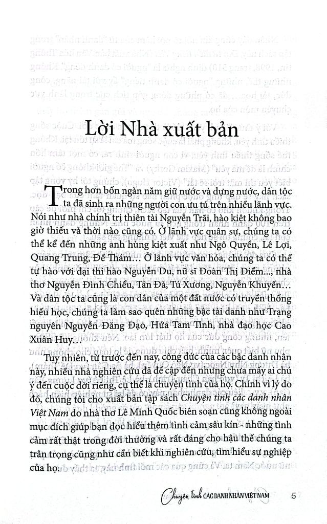 Tuy nhiên, từ trước đến nay, công đức của các bậc danh nhân này, nhiều nhà nghiên cứu đã đề cập đến nhưng chưa mấy ai chú ý đến cuộc đời riêng, cụ thể là chuyện tình của họ. Chính vì lý do đó, chúng tôi cho xuất bản tập sách Chuyện tình các danh nhân Việt Nam do nhà thơ Lê Minh Quốc biên soạn cũng không ngoài mục đích giúp bạn đọc hiểu thêm tình cảm sâu kín - những tình cảm rất thật trong đời thường và rất đáng cho hậu thế chúng ta trân trọng cũng như cần biết khi nghiên cứu, tìm hiểu sự nghiệp của họ.