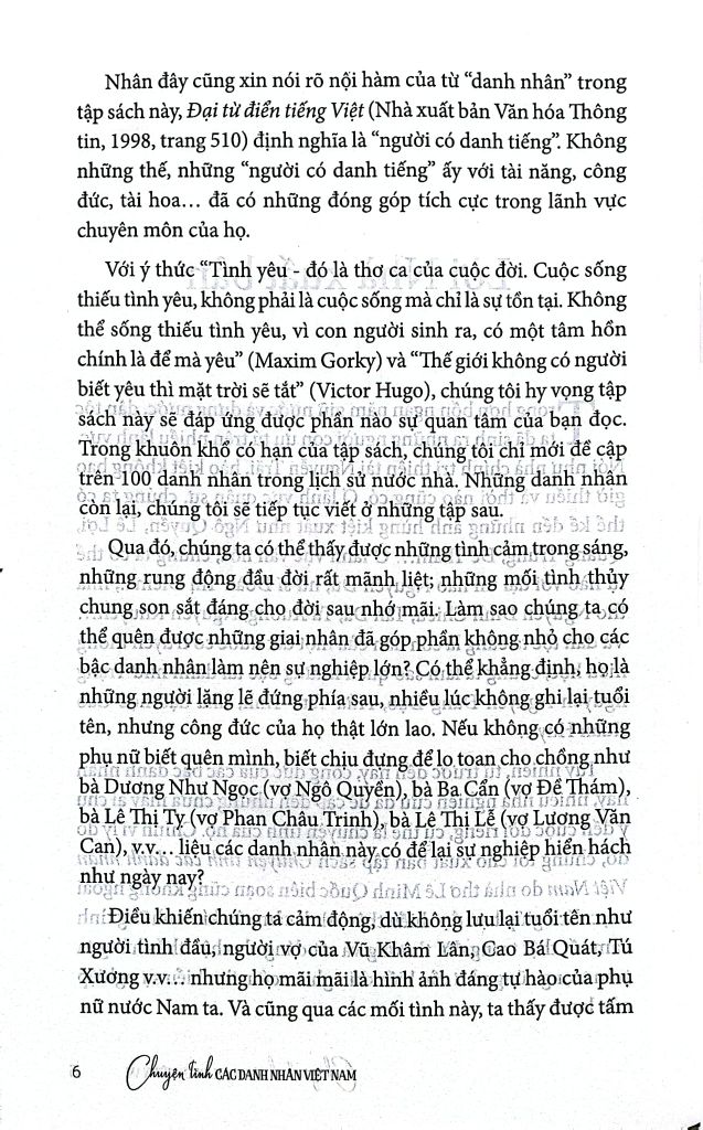 Với ý thức “Tình yêu - đó là thơ ca của cuộc đời. Cuộc sống thiếu tình yêu, không phải là cuộc sống mà chỉ là sự tồn tại. Không thể sống thiếu tình yêu, vì con người sinh ra, có một tâm hồn chính là để mà yêu” (Maxim Gorky) và “Thế giới không có người biết yêu thì mặt trời sẽ tắt” (Victor Hugo), chúng tôi hy vọng tập sách này sẽ đáp ứng được phần nào sự quan tâm của bạn đọc. Trong khuôn khổ có hạn của tập sách, chúng tôi chỉ mới đề cập trên 100 danh nhân trong lịch sử nước nhà. Những danh nhân còn lại, chúng tôi sẽ tiếp tục viết ở những tập sau.