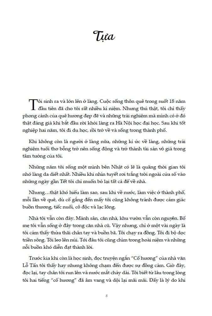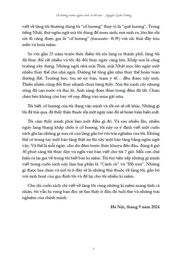 Không đi theo lối kể chuyện tuyến tính hay ghi chép lịch sử khô cứng, cuốn sách được xây dựng từ những mảnh ký ức rời, những quan sát tinh tế và suy ngẫm lắng đọng. Nguyễn Quốc Vương chú trọng tái hiện không khí của “cố hương” – không chỉ như một địa danh cụ thể, mà như một không gian tinh thần, nơi lưu giữ những giá trị truyền thống, nếp sống và cách cảm nhận thế giới của con người trong quá khứ.