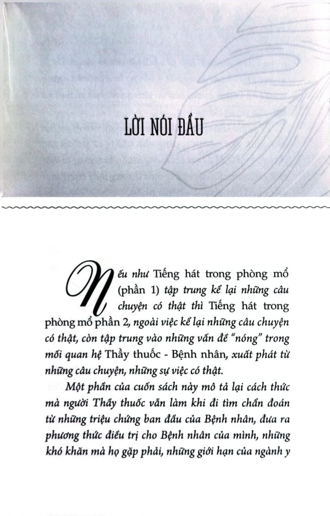 Nếu như Tiếng hát trong phòng mổ (phần 1) tập trung kể lại những câu chuyện có thật thì Tiếng hát trong phòng mổ phần 2, ngoài việc kể lại những câu chuyện có thật, còn tập trung vào những vấn đề "nóng" trong mối quan hệ Thầy thuốc - Bệnh nhân, xuất phát từ những câu chuyện, những sự việc có thật.