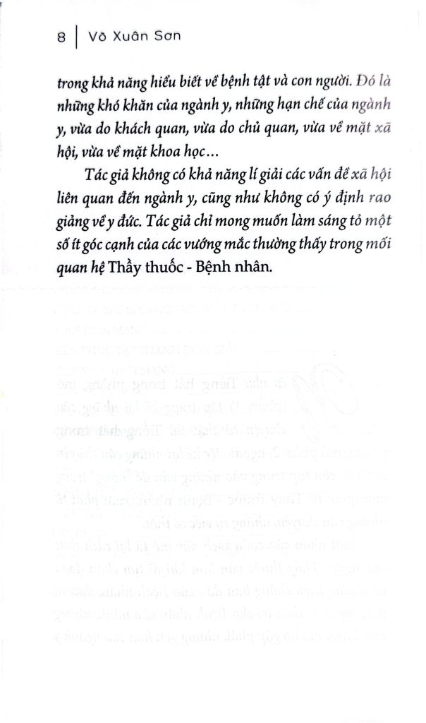 Tác giả không có khả năng lý giải các vấn đề xã hội liên quan đến ngành y, cũng như không có ý định rao giảng về y đức. Tác giả chỉ mong muốn làm sáng tỏ một số ít góc cạnh của các vướng mắc thường thấy trong mối quan hệ Thầy thuốc - Bệnh nhân.