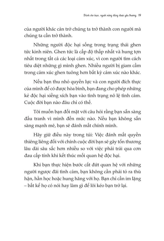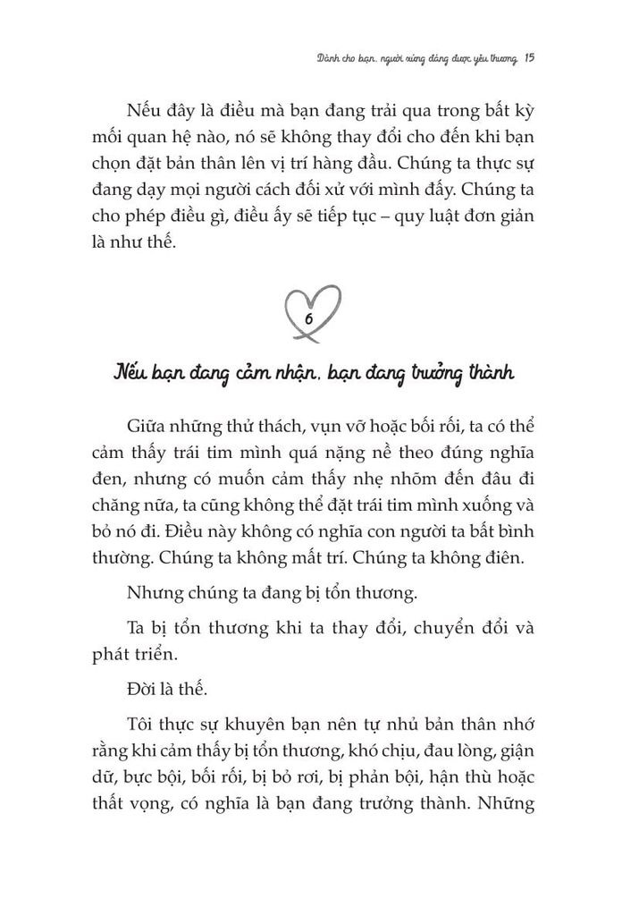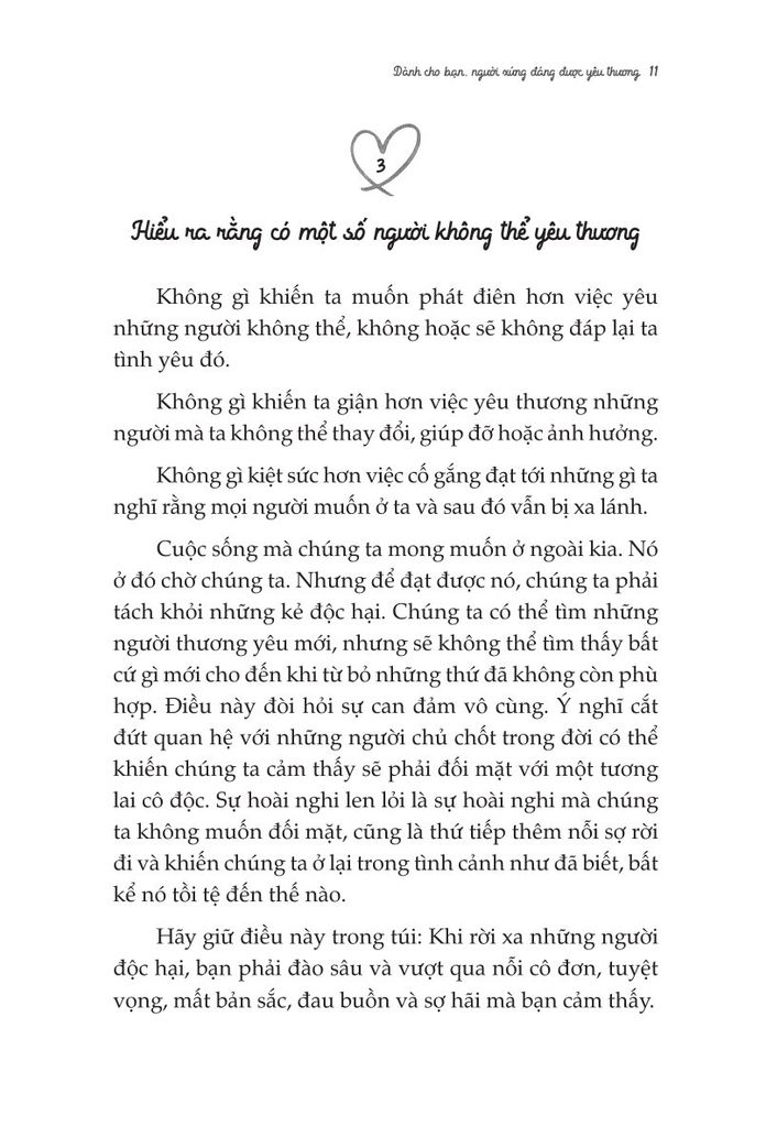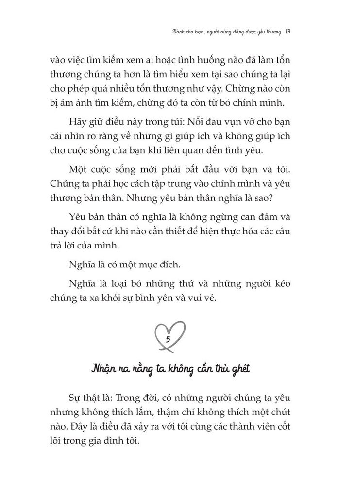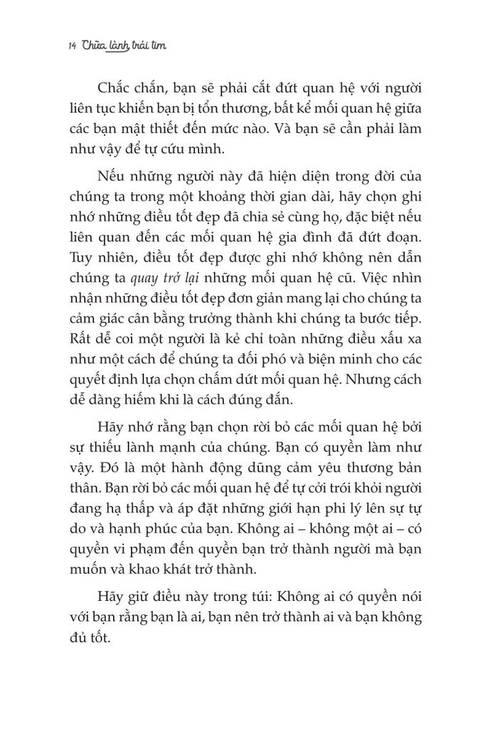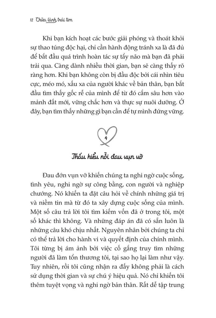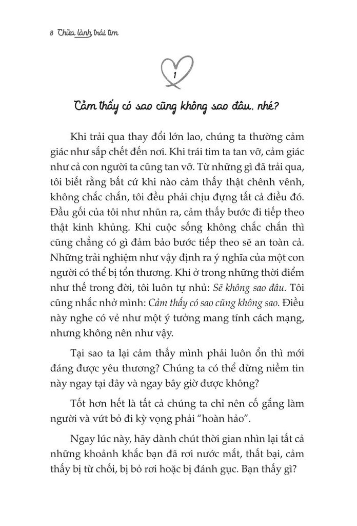 Lời văn nhẹ nhàng nhưng cũng thẳng thắn và đầy giá trị, cuốn sách sẽ giúp bạn “ngộ" ra nhiều điều, nhiều người và nhiều mối quan hệ bạn tưởng chừng như là đích thực và tốt nhất thế gian. Bạn sẽ biết mình phải làm gì trước mỗi sự thất bại, thất vọng, bị phản bội,... và vô số những nỗi niềm khác. Bạn sẽ bước qua nỗi đau, và trở thành một phiên bản khác. Bạn có thể tự chữa lành cho chính bản thân mình. Đừng lo, bạn làm được mà! Chỉ cần Chữa lành trái tim - Dành cho bạn, người xứng đáng được yêu thương.'