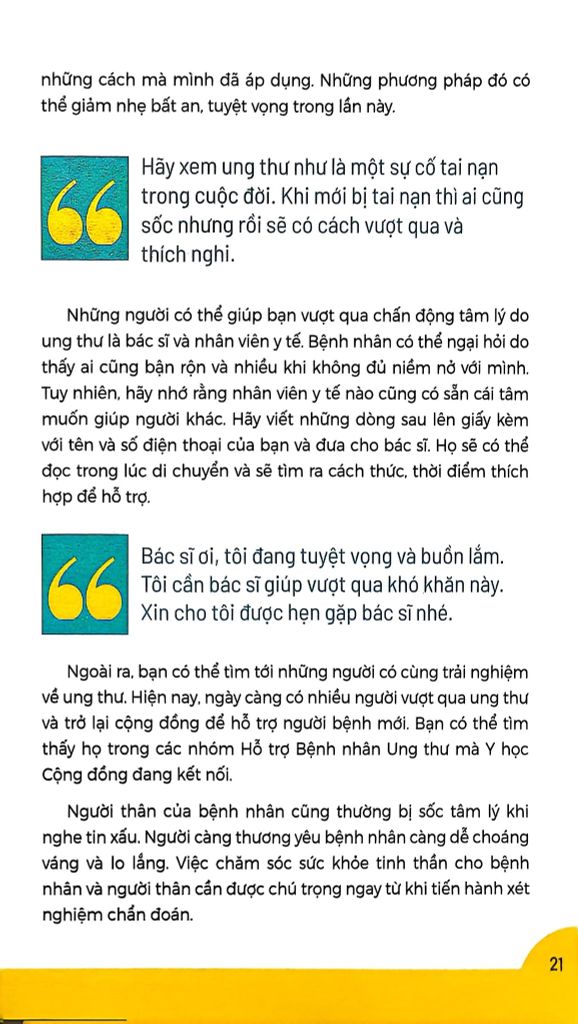 Trước tình cảnh đó, cuốn sách “Đồng hành cùng bệnh nhân ung thư: Cẩm nang cho bệnh nhân và người thân” ra đời với mong muốn nhằm giúp đỡ, sánh bước và giải đáp tất tần tật thắc mắc về căn bệnh đe dọa đến mạng sống này. Cuốn sách như một người bác sĩ tận tâm luôn xuất hiện mọi lúc để giải đáp tất cả những khúc mắc về căn bệnh ung thư. Từ những điều nhỏ bé như phải đối mặt sao khi nhận được “tin xấu” cho đến cả những điều khó nói như việc vệ sinh, mọi thứ một bệnh nhân ung thư cần đều có trong cuốn sách “Đồng hành cùng bệnh nhân ung thư: Cẩm nang cho bệnh nhân và người thân”.