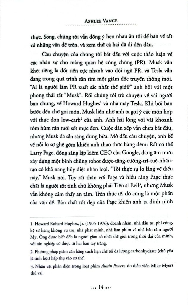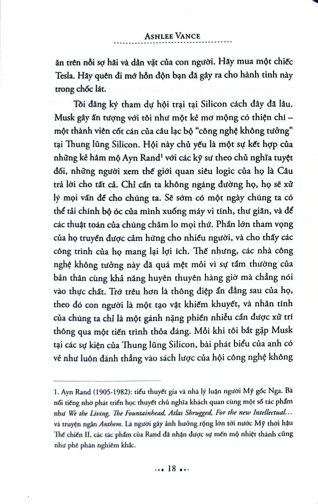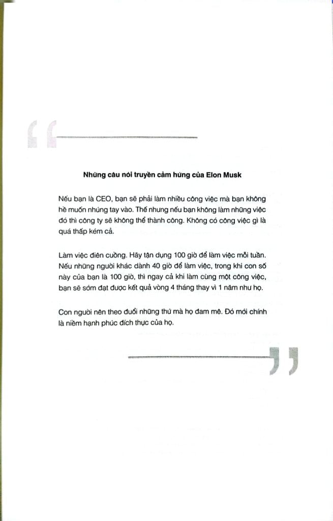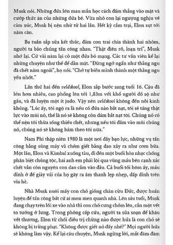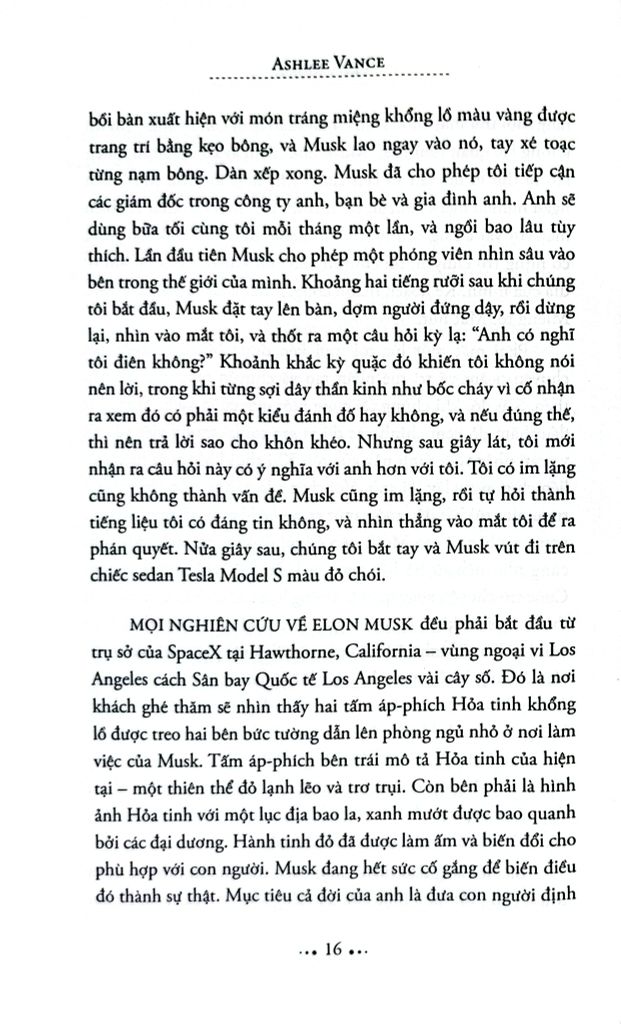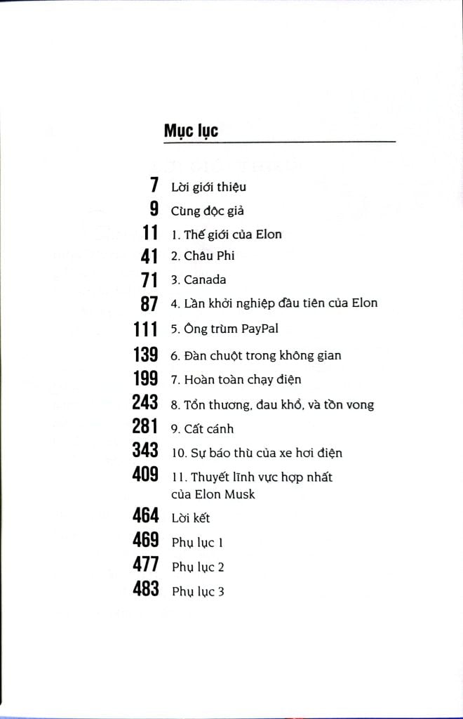 Trong cuốn Elon Musk: Tesla, SpaceX và sứ mệnh tìm kiếm một tương lai ngoài sức tưởng tượng, nhà báo công nghệ kỳ cựu Ashlee Vance đã mở cánh cửa đầu tiền nhìn vào cuộc sống phi thường của doanh nhân táo bạo nhất thung lũng Silicon. Được viết với độc quyền tiếp cận Musk, gia đình và bạn bè anh, cuốn sách lần theo cuộc hành trình của doanh nhân này, từ thuở nhỏ được nuôi dạy ở Nam Phi đến khi lên đến đỉnh cao của giới kinh doanh toàn cầu. Vance dành hơn 30 giờ trò chuyện với Musk và phỏng vấn gần 300 người để kể những câu chuyện đầy biến động về các công ty đang làm thay đổi thế giới mà Musk thành lập: PayPal, Tesla Motors, SpaceX và SolarCity, và để mô tả một người đàn ông đã tạo sức sống mới cho ngành công nghiệp Mỹ và thổi bùng tinh thần đổi mới ở một cấp độ khác, trong khi cũng tạo nên không ít kẻ thù trên con đường đó.