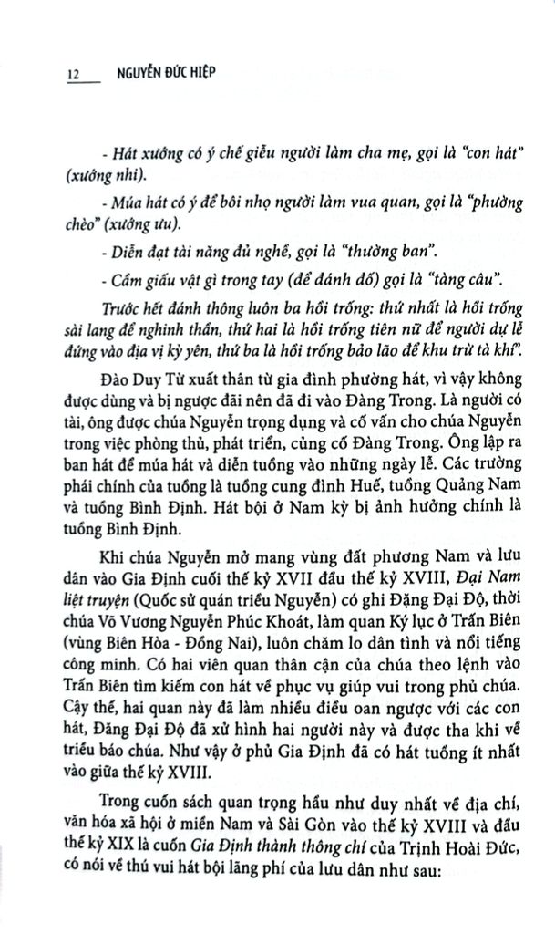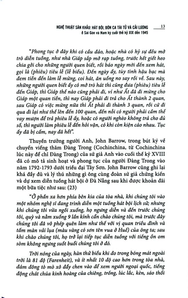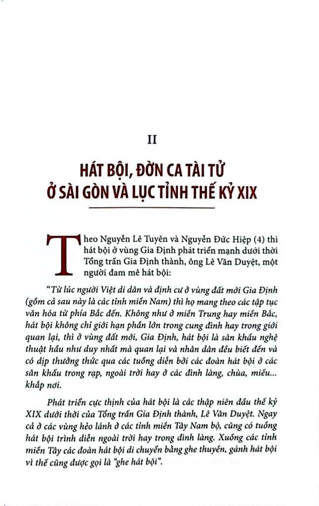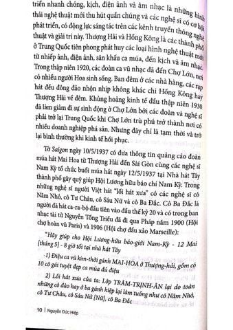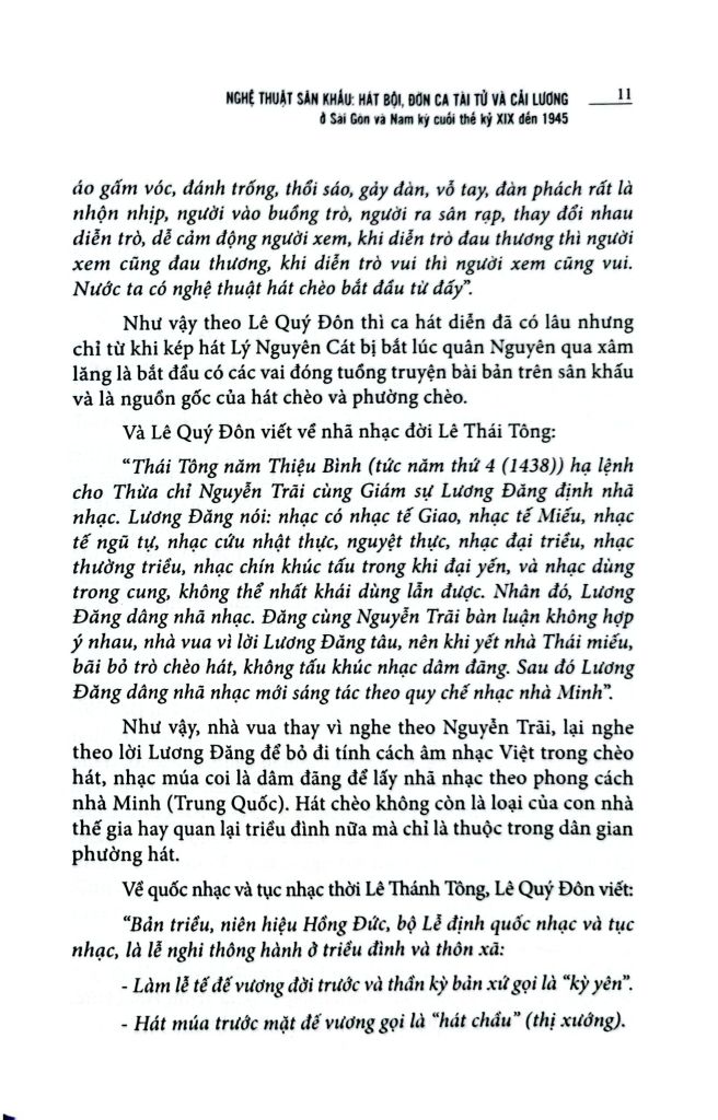 Nghệ thuật sân khấu: Hát bội, đờn ca tài tử và cải lương ở Sài Gòn và Nam Kỳ cuối thế kỷ XIX đến 1945 dựa trên một số tư liệu sách báo nhằm mục đích phác họa cho độc giả thấy bối cảnh và sự phát triển của các loại hình nghệ thuật sân khấu như hát bội, nhạc tài tử, ca ra bộ, cải lương và sự phong phú của lịch sử nghệ thuật sân khấu ở Sài Gòn nói riêng và Nam Kỳ nói chung trong giai đoạn cuối thế kỷ XIX đến 1945.