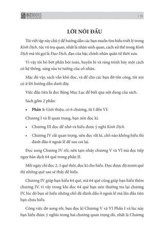 Kinh Dịch thật là thú vị nhưng cũng thật là khó đọc. Bởi vậy, một khi đã đọc con người sẽ có được Tâm - Tầm - Trải - Ngẫm. Cũng vì thế mà tác giả có viết “Đọc mãi không hiểu đừng vội lấy làm lạ. Đọc lại chỉ hiểu thêm một ít. Đọc thêm nữa lại hiểu nhiều hơn. Chính vì vậy, các bạn trẻ đừng đọc Kinh Dịch như đọc tiểu thuyết mà nên đọc dẫn từng đoạn, đọc vào lúc yên tĩnh, lúc tâm hồn êm, thanh thoát.”