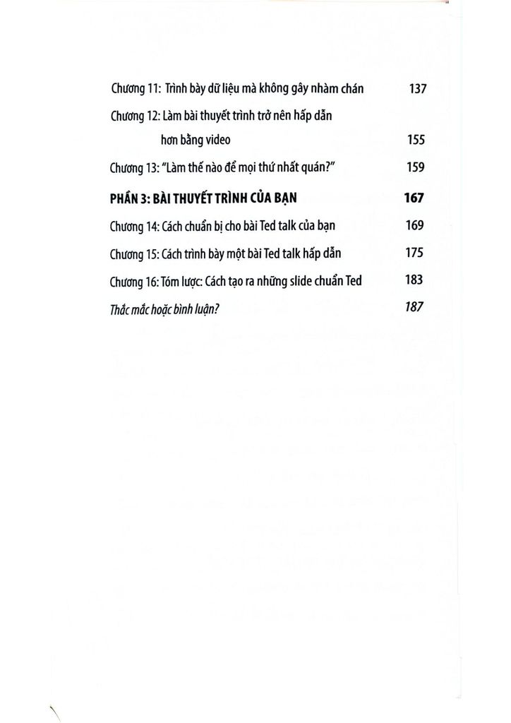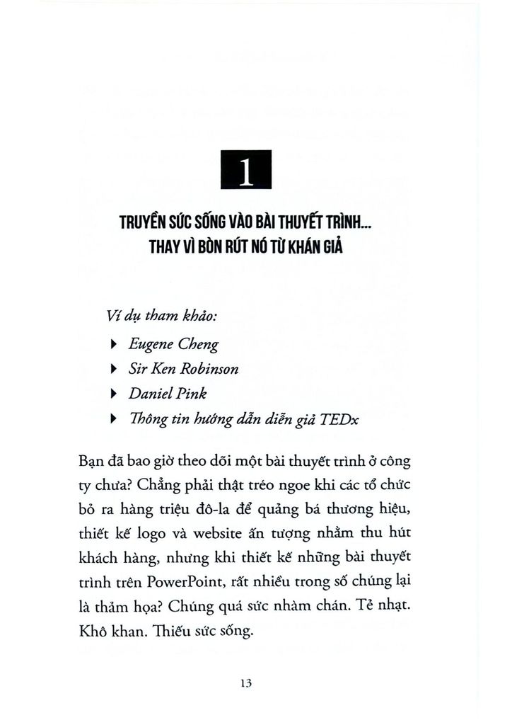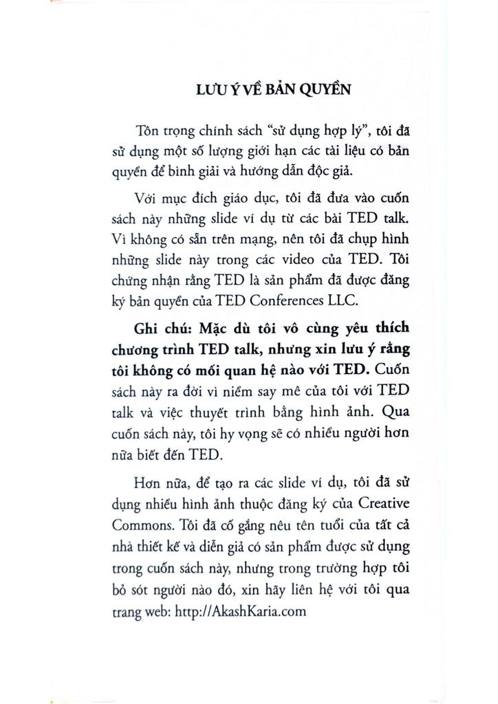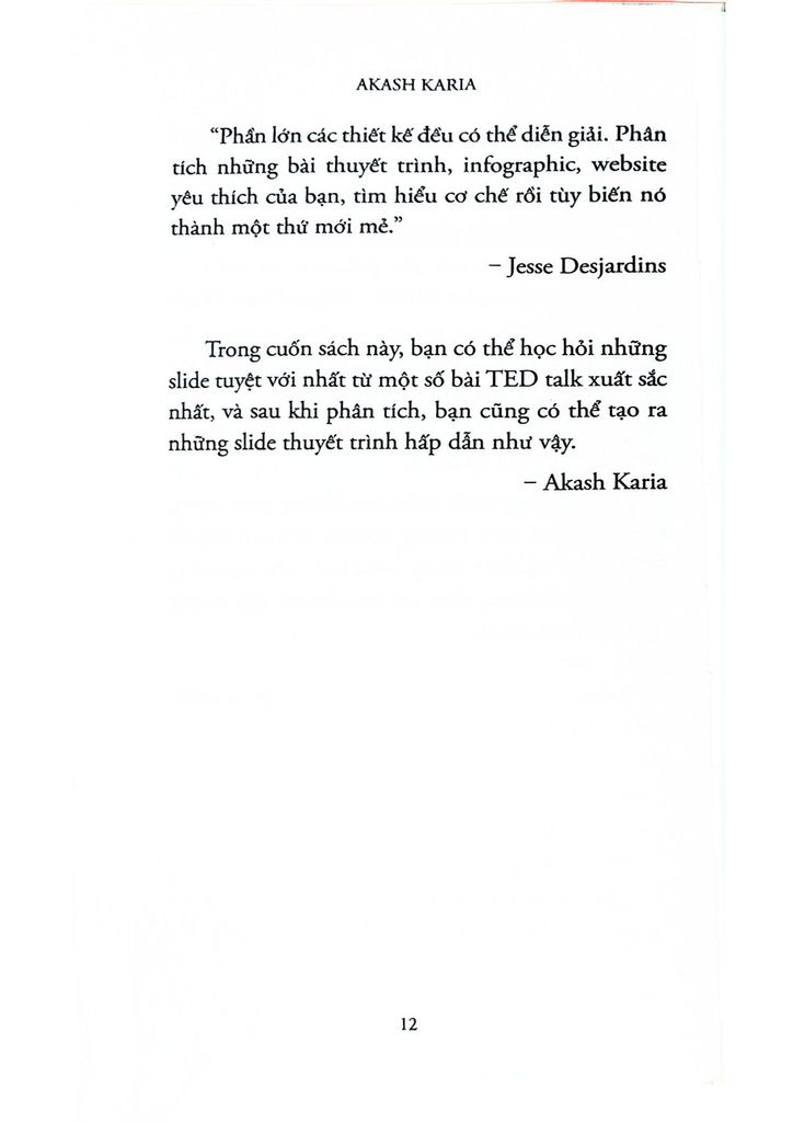 Nguyên tắc thiết kế slide chuẩn TED không phải là sách vỡ lòng đầy đủ về việc thiết kế bài thuyết trình. Tuy nhiên, nó bao quát tất thảy các yếu tố cần thiết. Nguyên tắc thiết kế slide chuẩn TED được viết rất cô đọng phù hợp cho những người không muốn lãng phí thời gian vào những điều vô bổ. Trong cuốn sách này, bạn sẽ tìm thấy các ví dụ về những slide hấp dẫn từ các bài TED talk ấn tượng, cùng với đó là những nguyên tắc thiết thực mà bạn có thể vận dụng để khiến bài thuyết trình của mình trở nên sống động.