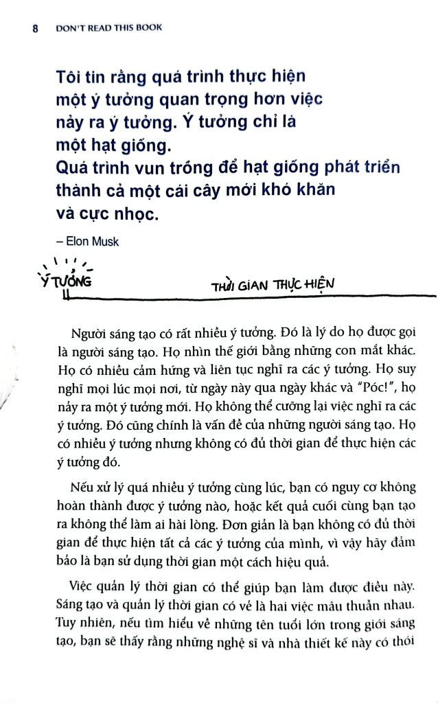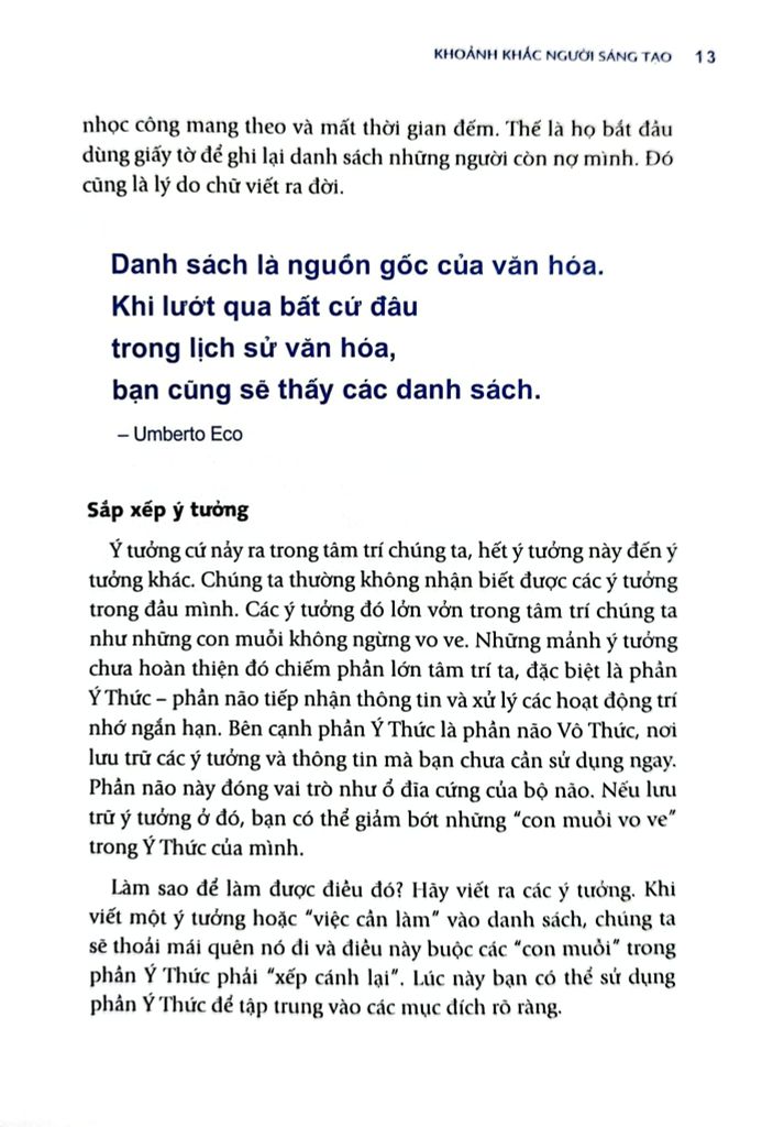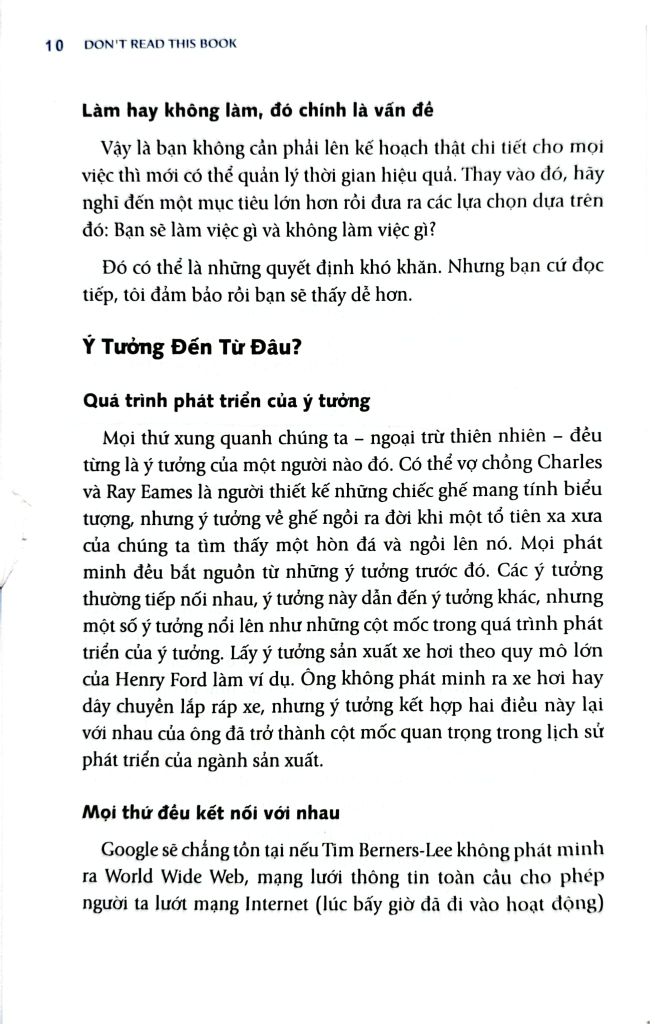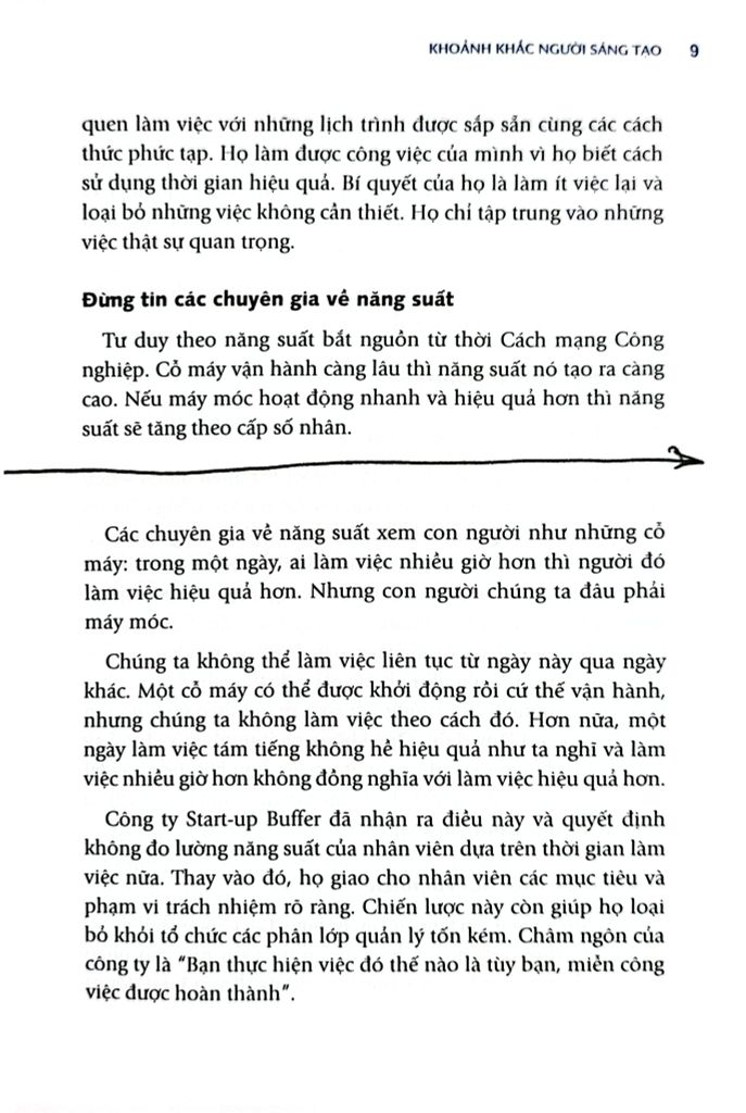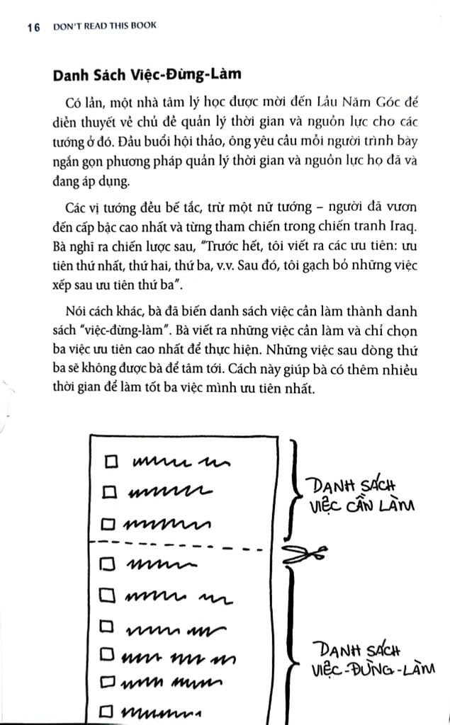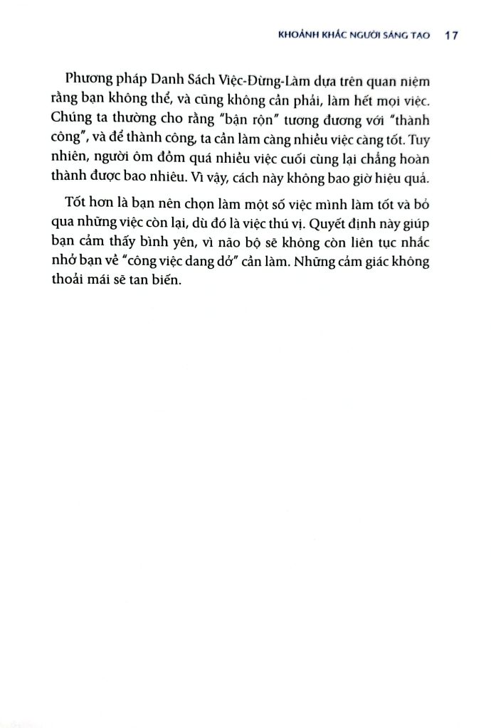 "Danh Sách Việc-Đừng-Làm" là phương pháp chủ đạo được giới thiệu trong "Khoảnh khắc người sáng tạo". Cuốn sách này chứng minh, việc nói "không" với một số việc mới chính là cách để những người làm sáng tạo tiết kiệm thời gian. Càng loại bỏ nhiều việc không quan trọng, bạn càng tập trung tốt cho những việc quan trọng.